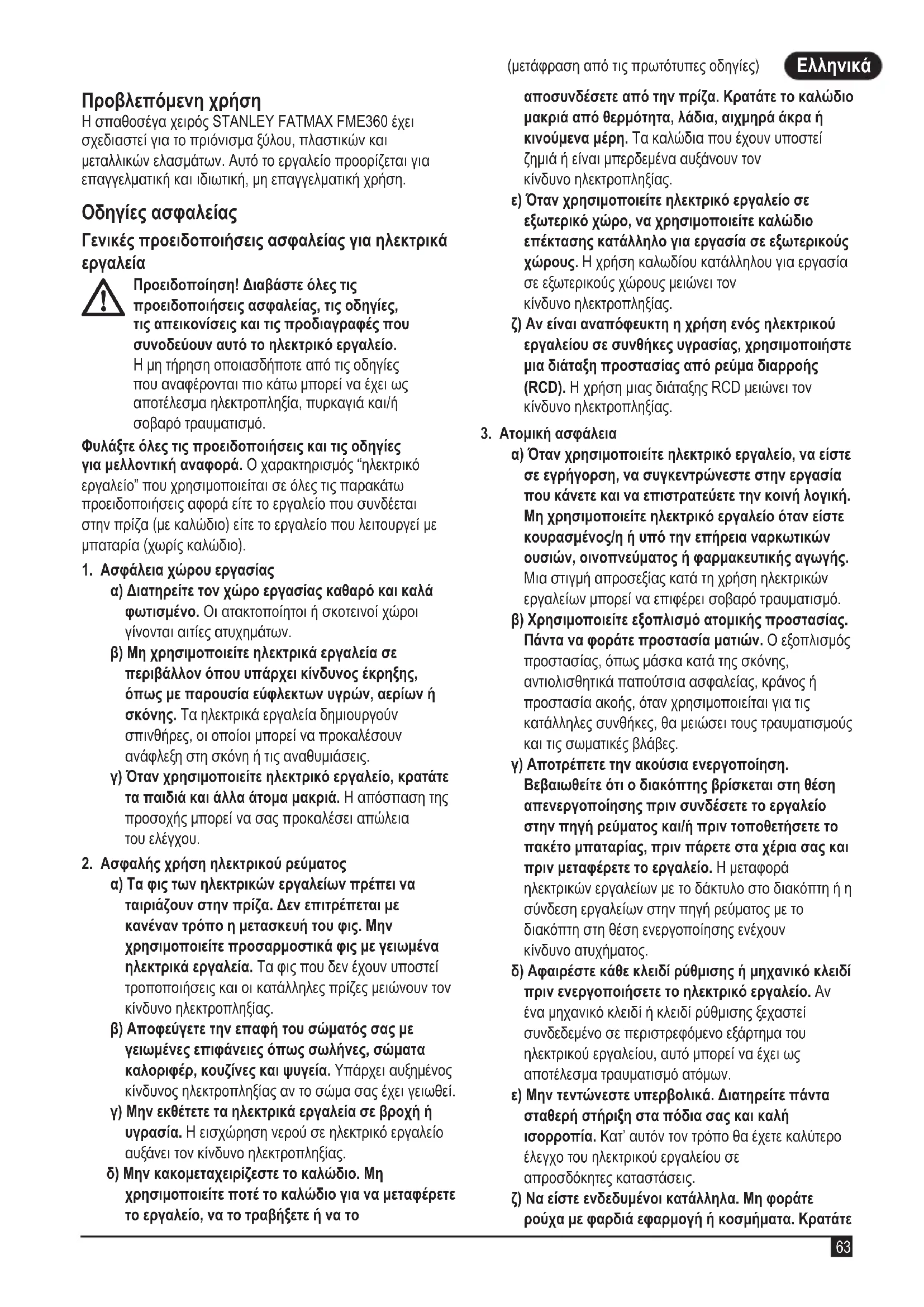 (μετάφραση από τις πρωτότυπες οδηγίες) Ελληνικά (μετάφραση από τις πρωτότυπες οδηγίες) Προβλεπόμενη χρήση Η σπαθοσέγα χειρός STANLEY FATMAX FME360 έχει σχεδιαστεί για το πριόνισμα ξύλου, πλαστικών και μεταλλικών ελασμάτων. Αυτό το εργαλείο προορίζεται για επαγγελματική και ιδιωτική, μη επαγγελματική χρήση. Οδηγίες ασφαλείας Γενικές προειδοποιήσεις ασφαλείας για ηλεκτρικά