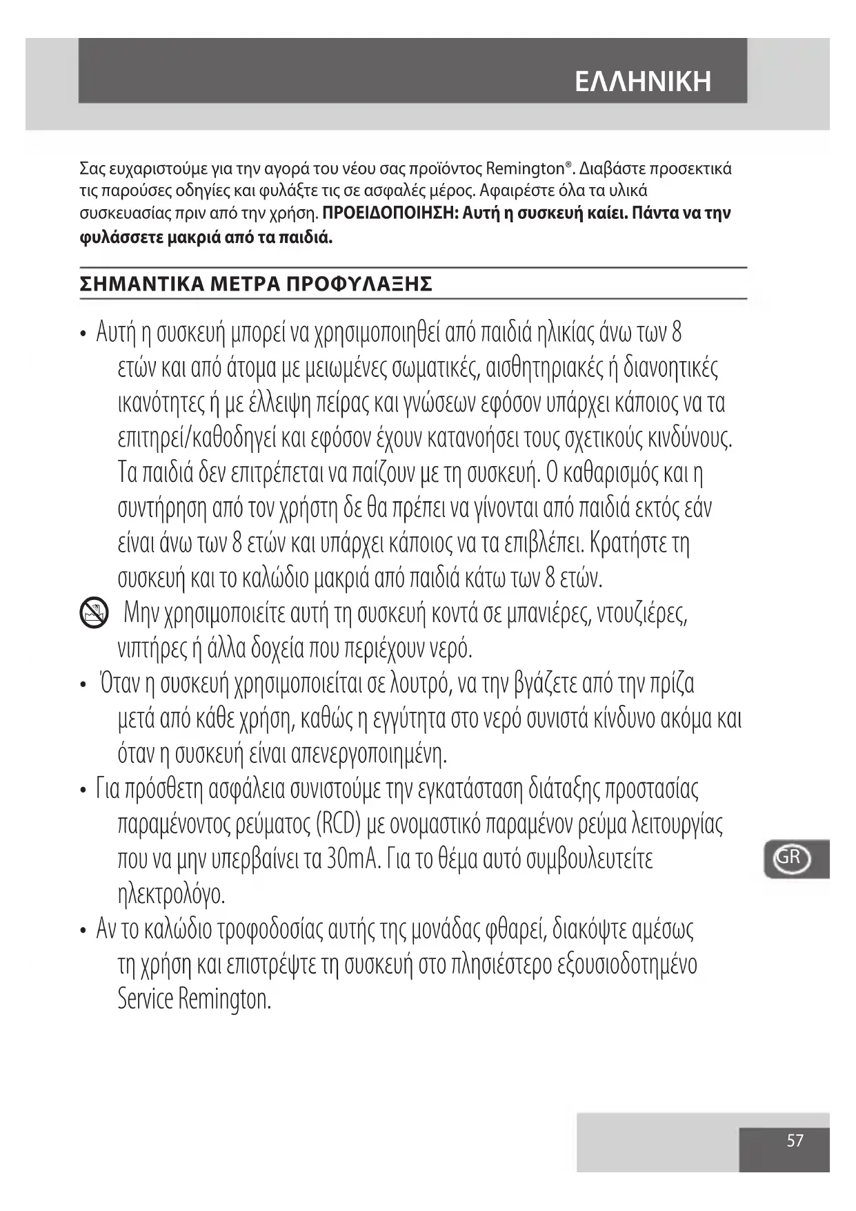 - Αν το καλώδιο τροφοδοσίας αυτής της μονάδας φθαρεί, διακόψτε αμέσως τη χρήση και επιστρέψτε τη συσκευή στο πλησιέστερο εξουσιοδοτημένο Service Remington.