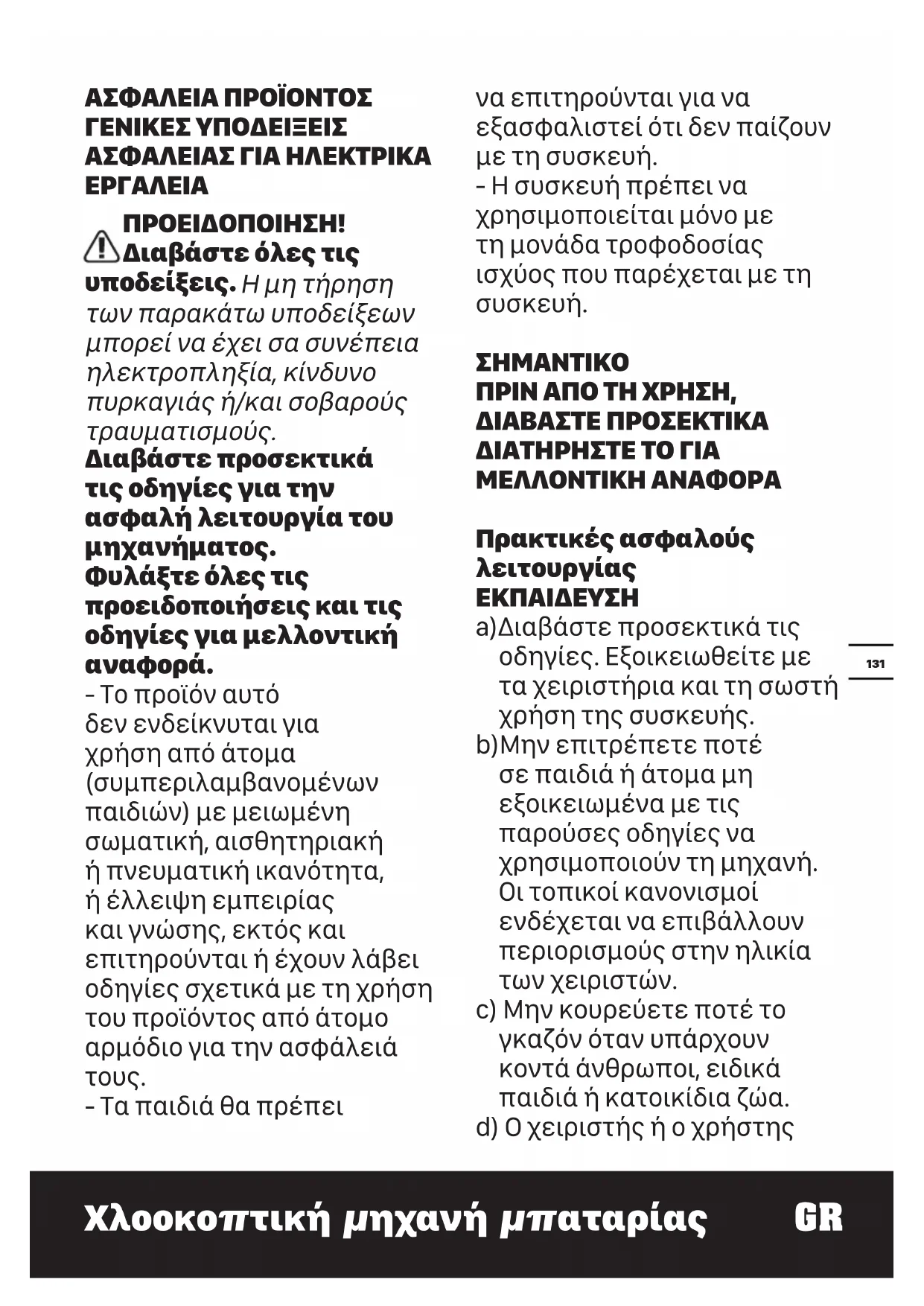 a)Διαβάστε προσεκτικά τις οδηγίες. Εξοικειωθείτε με τα χειριστήρια και τη σωστή χρήση της συσκευής. b)Μην επιτρέπετε ποτέ σε παιδιά ή άτομα μη εξοικειωμένα με τις παρούσες οδηγίες να χρησιμοποιούν τη μηχανή. Οι τοπικοί κανονισμοί ενδέχεται να επιβάλλουν περιορισμούς στην ηλικία των χειριστών. c) Μην κουρεύετε ποτέ το γκαζόν όταν υπάρχουν κοντά άνθρωποι, ειδικά παιδιά ή κατοικίδια ζώα. d) Ο χειριστής ή ο χρήστης132 Χλοοκοπτική μηχανή μπαταρίας GR είναι υπεύθυνος για πιθανά ατυχήματα ή κινδύνους που συμβαίνουν σε άλλα άτομα ή στην περιουσία τους. ΠΡΟΕΤΟΙΜΑΣΙΑ a) Όταν κουρεύετε το γκαζόν, να φοράτε πάντα γερά παπούτσια και μακρύ παντελόνιΜην χρησιμοποιείτε τη μηχανή με γυμνά πόδια ή με ανοιχτά πέδιλα ή σανδάλια. b) Επιθεωρήστε με προσοχή την περιοχή στην οποία πρόκειται να χρησιμοποιηθεί η συσκευή και απομακρύνετε όλες τις πέτρες, κλαδάκια, σύρματα, κόκαλα και άλλα ξένα αντικείμενα. c) Πριν τη χρήση, να επιθεωρείτε πάντα οπτικά για να δείτε αν οι λεπίδες, τα μάνδαλα των λεπίδων και το εξάρτημα κοπης δεν έχουν υποστεί φθορά ή βλάβη. Αντικαταστήστε φθαρμένες ή κατεστραμμένες λεπίδες και μάνδαλα ταυτόχρονα ώστε να υπάρχει ισορροπία.