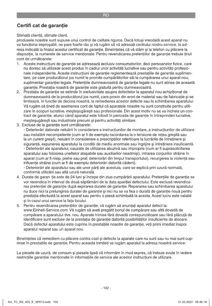 www.Einhell-Service.com. Να έχετε μαζί σας την απόδειξη της νέας συσκευής. Οι συσκευές που αποστέλλονται χωρίς αποδείξεις και χωρίς πινακίδα στοιχείων, αποκλείονται από την εγγύηση λόγω μη δυνατότητας ταξινόμησης. Εάν το ελάττωμα καλύπτεται από την εγγύηση, θα σας επιστραφεί αμέσως είτε η επισκευασμένη συσκευή είτε μία καινούργια συσκευή. Ευχαρίστως επισκευάζουμε ελαττώματα της συσκευής έναντι πληρωμής, εάν τα ελαττώματα αυτά δεν καλύπτονται από την εγγύηση. Για το σκοπό αυτό παρακαλούμε να στείλετε τη συσκευή στη διεύθυνση του σέρβις μας. Για αναλώσιμα και σε περίπτωση που λείπουν εξαρτήματα παραπέμπουμε στους περιορισμούς αυτής της εγγύησης σύμφωνα με τους πληροφορίες σέρβις αυτών των οδηγιών χρήσης. Anl_TC_RS_425_E_SPK13.indb 109Anl_TC_RS_425_E_SPK13.indb 109 31.03.2022 08:46:2131.03.2022 08:46:21P