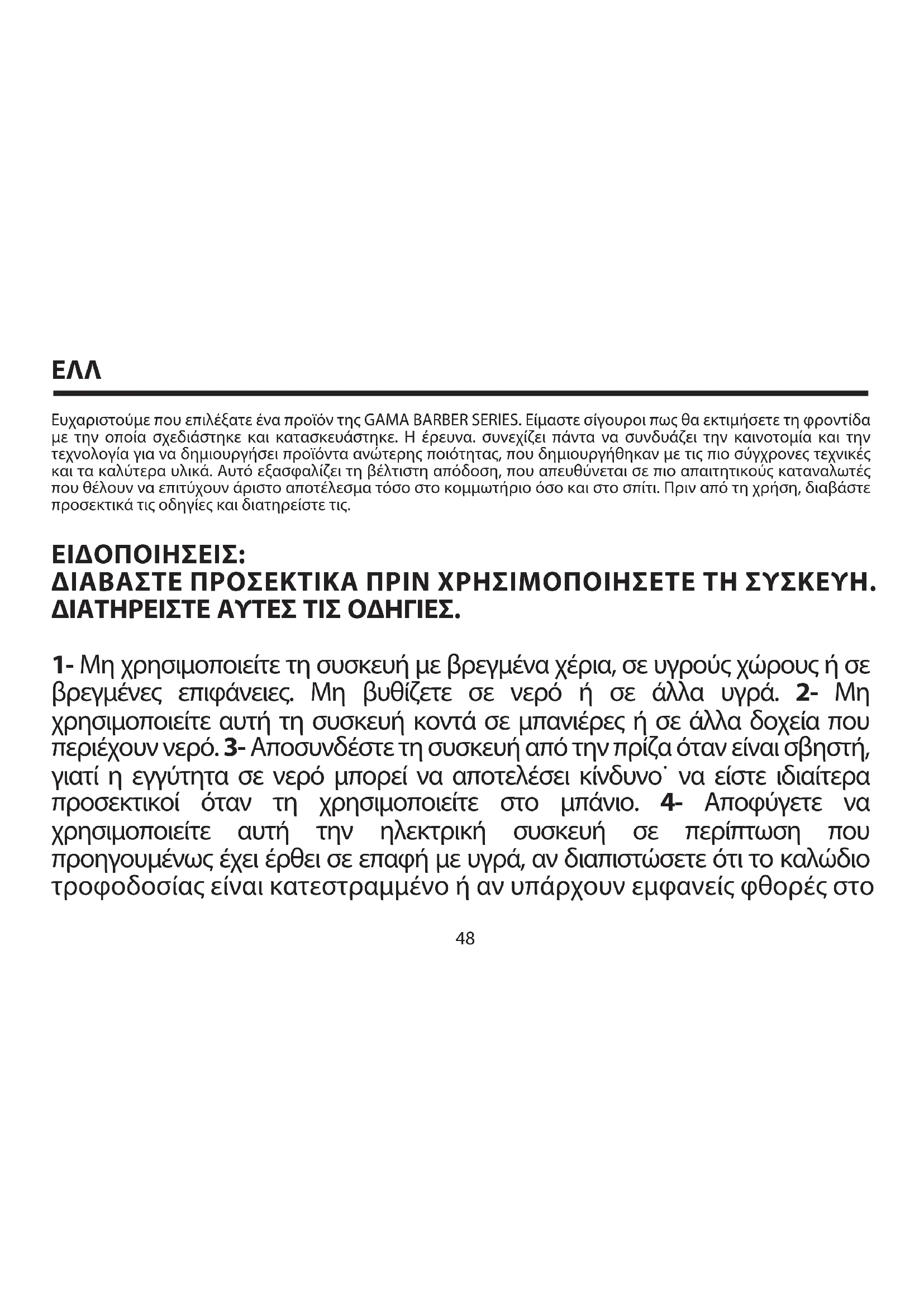 2. Insira a ficha na tomada e, subsequentemente, conecte o aparelho ao seu adaptador. O LED de carga acenderá e permanecerá vermelho durante todo o processo de carregamento. Assim que o produto estiver totalmente carregado, o LED mudará de cor. Mas cuidado: para prolongar a vida útil da pilha, a primeira carga deve ser muito maior, ainda que o LED mude de cor. 36ΕΛΛ Ευχαριστούμε που επιλέξατε ένα προϊόν της GAMA BARBER SERIES. Είμαστε σίγουροι πως θα εκτιμήσετε τη φροντίδα με την οποία σχεδιάστηκε και κατασκευάστηκε. Η έρευνα. συνεχίζει πάντα να συνδυάζει την καινοτομία και την τεχνολογία για να δημιουργήσει προϊόντα ανώτερης ποιότητας, που δημιουργήθηκαν με τις πιο σύγχρονες τεχνικές και τα καλύτερα υλικά. Αυτό εξασφαλίζει τη βέλτιστη απόδοση, που απευθύνεται σε πιο απαιτητικούς καταναλωτές που θέλουν να επιτύχουν άριστο αποτέλεσμα τόσο στο κομμωτήριο όσο και στο σπίτι. Πριν από τη χρήση, διαβάστε προσεκτικά τις οδηγίες και διατηρείστε τις. ΕΙΔΟΠΟΙΗΣΕΙΣ: ΔΙΑΒΑΣΤΕ ΠΡΟΣΕΚΤΙΚΑ ΠΡΙΝ ΧΡΗΣΙΜΟΠΟΙΗΣΕΤΕ ΤΗ ΣΥΣΚΕΥΗ. ΔΙΑΤΗΡΕΙΣΤΕ ΑΥΤΕΣ ΤΙΣ ΟΔΗΓΙΕΣ.