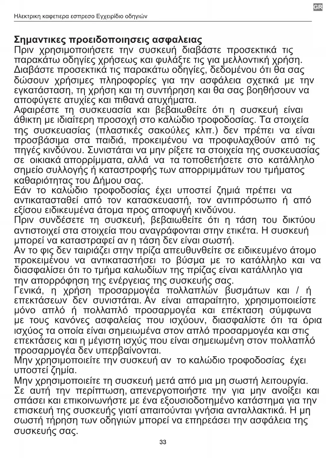 Σημαντικες προειδοποιησεις ασφαλειας Πριν χρησιμοποιήσετε την συσκευή διαβάστε προσεκτικά τις παρακάτω οδηγίες χρήσεως και φυλάξτε τις για μελλοντική χρήση. Διαβάστε προσεκτικά τις παρακάτω οδηγίες, δεδομένου ότι θα σας δώσουν χρήσιμες πληροφορίες για την ασφάλεια σχετικά με την εγκατάσταση, τη χρήση και τη συντήρηση και θα σας βοηθήσουν να αποφύγετε ατυχίες και πιθανά ατυχήματα. Αφαιρέστε τη συσκευασία και βεβαιωθείτε ότι η συσκευή είναι άθικτη με ιδιαίτερη προσοχή στο καλώδιο τροφοδοσίας. Τα στοιχεία της συσκευασίας (πλαστικές σακούλες κλπ.) δεν πρέπει να είναι προσβάσιμα στα παιδιά, προκειμένου να προφυλαχθούν από τις πηγές κινδύνου. Συνιστάται να μην ρίξετε τα στοιχεία της συσκευασίας σε οικιακά απορρίμματα, αλλά να τα τοποθετήσετε στο κατάλληλο σημείο συλλογής ή καταστροφής των απορριμμάτων του τμήματος καθαριότητας του Δήμου σας. Εάν το καλώδιο τροφοδοσίας έχει υποστεί ζημιά πρέπει να αντικατασταθεί από τον κατασκευαστή, τον αντιπρόσωπο ή από εξίσου ειδικευμένα άτομα προς αποφυγή κινδύνου. Πριν συνδέσετε τη συσκευή, βεβαιωθείτε ότι η τάση του δικτύου αντιστοιχεί στα στοιχεία που αναγράφονται στην ετικέτα. Η συσκευή μπορεί να καταστραφεί αν η τάση δεν είναι σωστή. Αν το φις δεν ταιριάζει στην πρίζα απευθυνθείτε σε ειδικευμένο άτομο προκειμένου να αντικαταστήσει το βύσμα με το κατάλληλο και να διασφαλίσει ότι το τμήμα καλωδίων της πρίζας είναι κατάλληλο για την απορρόφηση της ενέργειας της συσκευής σας. Γενικά, η χρήση προσαρμογέα πολλαπλών βυσμάτων και / ή επεκτάσεων δεν συνιστάται. Αν είναι απαραίτητο, χρησιμοποιείστε μόνο απλό ή πολλαπλό προσαρμογέα και επέκταση σύμφωνα με τους κανόνες ασφαλείας που ισχύουν, διασφαλίστε ότι τα όρια ισχύος τα οποία είναι σημειωμένα στον απλό προσαρμογέα και στις επεκτάσεις και η μέγιστη ισχύς που είναι σημειωμένη στον πολλαπλό προσαρμογέα δεν υπερβαίνονται. Μην χρησιμοποιείτε την συσκευή αν το καλώδιο τροφοδοσίας έχει υποστεί ζημία. Μην χρησιμοποιείτε τη συσκευή μετά από μια μη σωστή λειτουργία. Σε αυτή την περίπτωση, απενεργοποιήστε την για μην ανοίξει και σπάσει και επικοινωνήστε με ένα εξουσιοδοτημένο κατάστημα για την επισκευή της συσκευής γιατί απαιτούνται γνήσια ανταλλακτικά. Η μη σωστή τήρηση των οδηγιών μπορεί να επηρεάσει την ασφάλεια της συσκευής σας.Ηλεκτρικη καφετιερα εσπρεσο Εγχειρίδιο οδηγιών