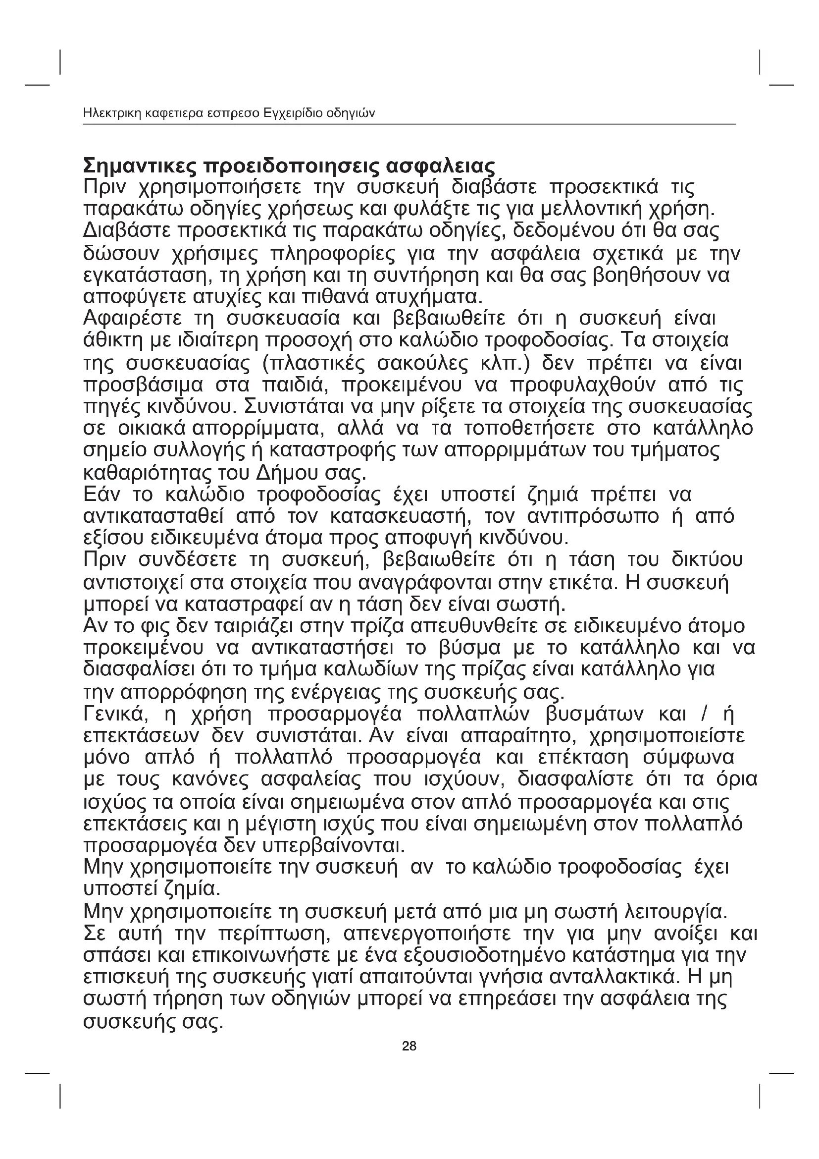 Σημαντικες προειδοποιησεις ασφαλειας Πριν χρησιμοποιήσετε την συσκευή διαβάστε προσεκτικά τις παρακάτω οδηγίες χρήσεως και φυλάξτε τις για μελλοντική χρήση. Διαβάστε προσεκτικά τις παρακάτω οδηγίες, δεδομένου ότι θα σας δώσουν χρήσιμες πληροφορίες για την ασφάλεια σχετικά με την εγκατάσταση, τη χρήση και τη συντήρηση και θα σας βοηθήσουν να αποφύγετε ατυχίες και πιθανά ατυχήματα. Αφαιρέστε τη συσκευασία και βεβαιωθείτε ότι η συσκευή είναι άθικτη με ιδιαίτερη προσοχή στο καλώδιο τροφοδοσίας. Τα στοιχεία της συσκευασίας (πλαστικές σακούλες κλπ.) δεν πρέπει να είναι προσβάσιμα στα παιδιά, προκειμένου να προφυλαχθούν από τις πηγές κινδύνου. Συνιστάται να μην ρίξετε τα στοιχεία της συσκευασίας σε οικιακά απορρίμματα, αλλά να τα τοποθετήσετε στο κατάλληλο σημείο συλλογής ή καταστροφής των απορριμμάτων του τμήματος καθαριότητας του Δήμου σας. Εάν το καλώδιο τροφοδοσίας έχει υποστεί ζημιά πρέπει να αντικατασταθεί από τον κατασκευαστή, τον αντιπρόσωπο ή από εξίσου ειδικευμένα άτομα προς αποφυγή κινδύνου. Πριν συνδέσετε τη συσκευή, βεβαιωθείτε ότι η τάση του δικτύου αντιστοιχεί στα στοιχεία που αναγράφονται στην ετικέτα. Η συσκευή μπορεί να καταστραφεί αν η τάση δεν είναι σωστή. Αν το φις δεν ταιριάζει στην πρίζα απευθυνθείτε σε ειδικευμένο άτομο προκειμένου να αντικαταστήσει το βύσμα με το κατάλληλο και να διασφαλίσει ότι το τμήμα καλωδίων της πρίζας είναι κατάλληλο για την απορρόφηση της ενέργειας της συσκευής σας. Γενικά, η χρήση προσαρμογέα πολλαπλών βυσμάτων και / ή επεκτάσεων δεν συνιστάται. Αν είναι απαραίτητο, χρησιμοποιείστε μόνο απλό ή πολλαπλό προσαρμογέα και επέκταση σύμφωνα με τους κανόνες ασφαλείας που ισχύουν, διασφαλίστε ότι τα όρια ισχύος τα οποία είναι σημειωμένα στον απλό προσαρμογέα και στις επεκτάσεις και η μέγιστη ισχύς που είναι σημειωμένη στον πολλαπλό προσαρμογέα δεν υπερβαίνονται. Μην χρησιμοποιείτε την συσκευή αν το καλώδιο τροφοδοσίας έχει υποστεί ζημία. Μην χρησιμοποιείτε τη συσκευή μετά από μια μη σωστή λειτουργία. Σε αυτή την περίπτωση, απενεργοποιήστε την για μην ανοίξει και σπάσει και επικοινωνήστε με ένα εξουσιοδοτημένο κατάστημα για την επισκευή της συσκευής γιατί απαιτούνται γνήσια ανταλλακτικά. Η μη σωστή τήρηση των οδηγιών μπορεί να επηρεάσει την ασφάλεια της συσκευής σας.Ηλεκτρικη καφετιερα εσπρεσο Εγχειρίδιο οδηγιών