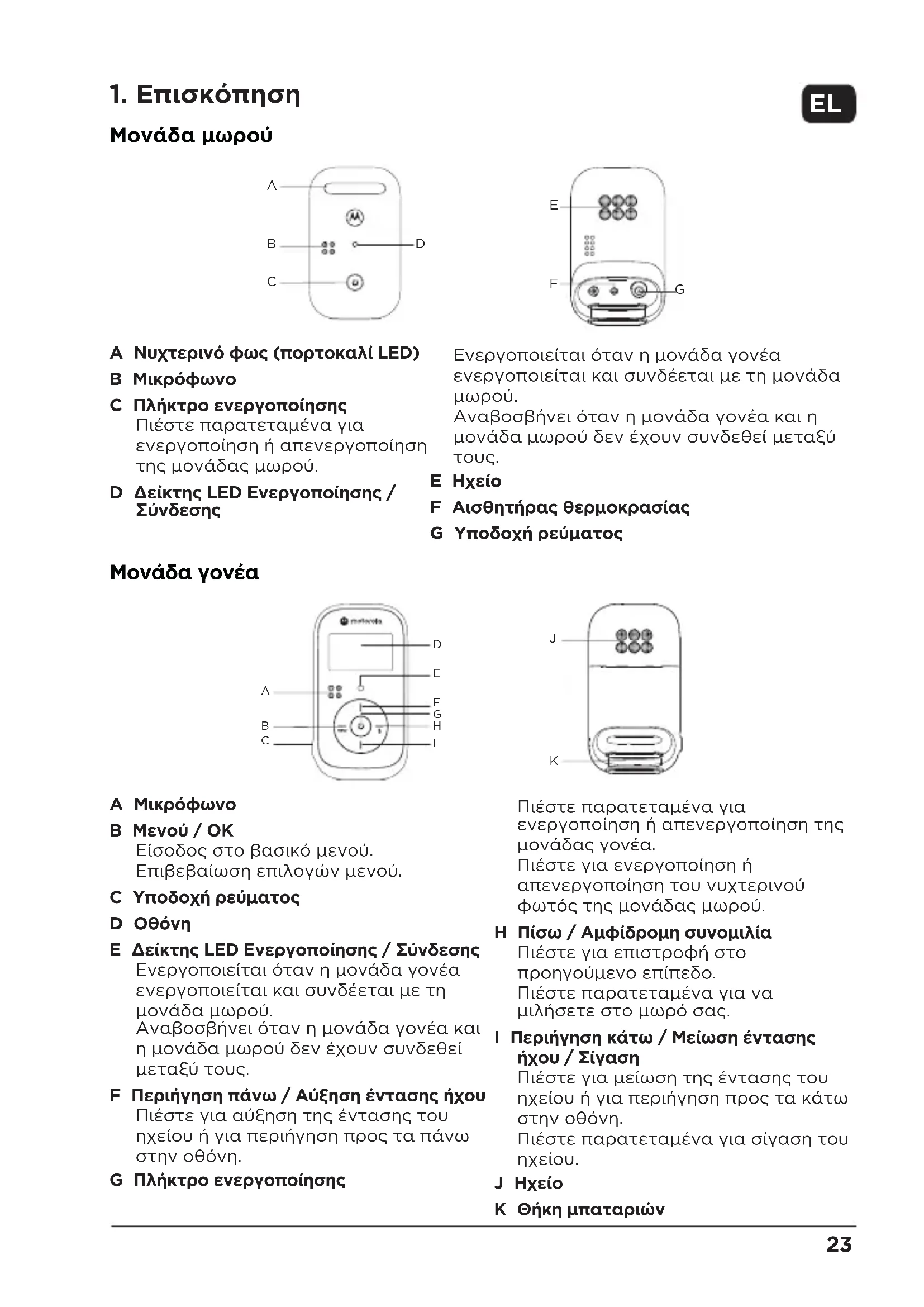E Ηχείο F Αισθητήρας θερμοκρασίας G Υποδοχή ρεύματος Μονάδα γονέα A Μικρόφωνο B Μενού / ΟΚ Είσοδος στο βασικό μενού. Επιβεβαίωση επιλογών μενού. C Υποδοχή ρεύματος D Οθόνη E Δείκτης LED Ενεργοποίησης / Σύνδεσης Ενεργοποιείται όταν η μονάδα γονέα ενεργοποιείται και συνδέεται με τη μονάδα μωρού. Αναβοσβήνει όταν η μονάδα γονέα και η μονάδα μωρού δεν έχουν συνδεθεί μεταξύ τους. F Περιήγηση πάνω / Αύξηση έντασης ήχου Πιέστε για αύξηση της έντασης του ηχείου ή για περιήγηση προς τα πάνω στην οθόνη. G Πλήκτρο ενεργοποίησης