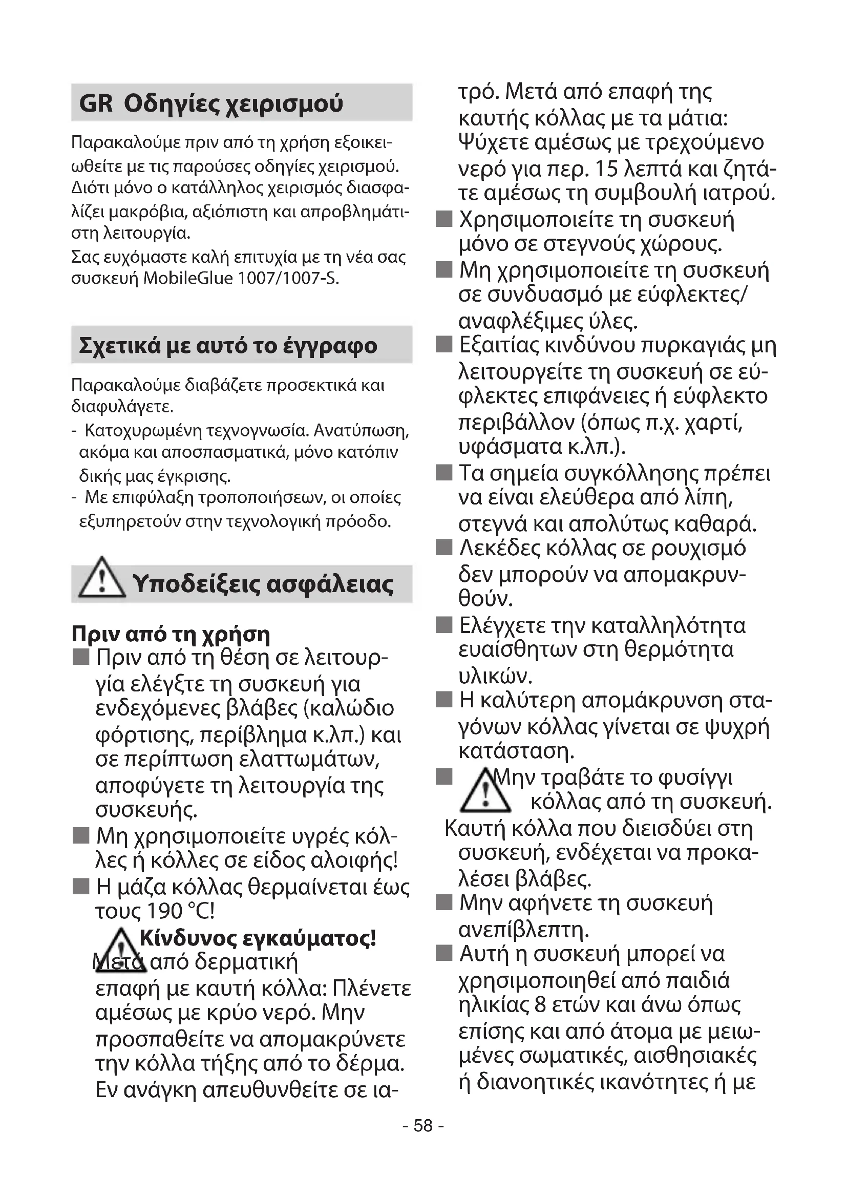 GARANTI PRODUSENT ÅRS GARANTI PRODUSENT ÅRS GARANTI NO- 58 - GR Οδηγίες χειρισμού Παρακαλούμε πριν από τη χρήση εξοικει- ωθείτε με τις παρούσες οδηγίες χειρισμού. Διότι μόνο ο κατάλληλος χειρισμός διασφα- λίζει μακρόβια, αξιόπιστη και απροβλημάτι- στη λειτουργία. Σας ευχόμαστε καλή επιτυχία με τη νέα σας συσκευή MobileGlue 1007/1007-S. Σχετικά με αυτό το έγγραφο Παρακαλούμε διαβάζετε προσεκτικά και διαφυλάγετε. - Κατοχυρωμένη τεχνογνωσία. Ανατύπωση, ακόμα και αποσπασματικά, μόνο κατόπιν δικής μας έγκρισης. - Με επιφύλαξη τροποποιήσεων, οι οποίες εξυπηρετούν στην τεχνολογική πρόοδο. Πριν από τη χρήση Πριν από τη θέση σε λειτουρ- γία ελέγξτε τη συσκευή για ενδεχόμενες βλάβες (καλώδιο φόρτισης, περίβλημα κ.λπ.) και σε περίπτωση ελαττωμάτων, αποφύγετε τη λειτουργία της
