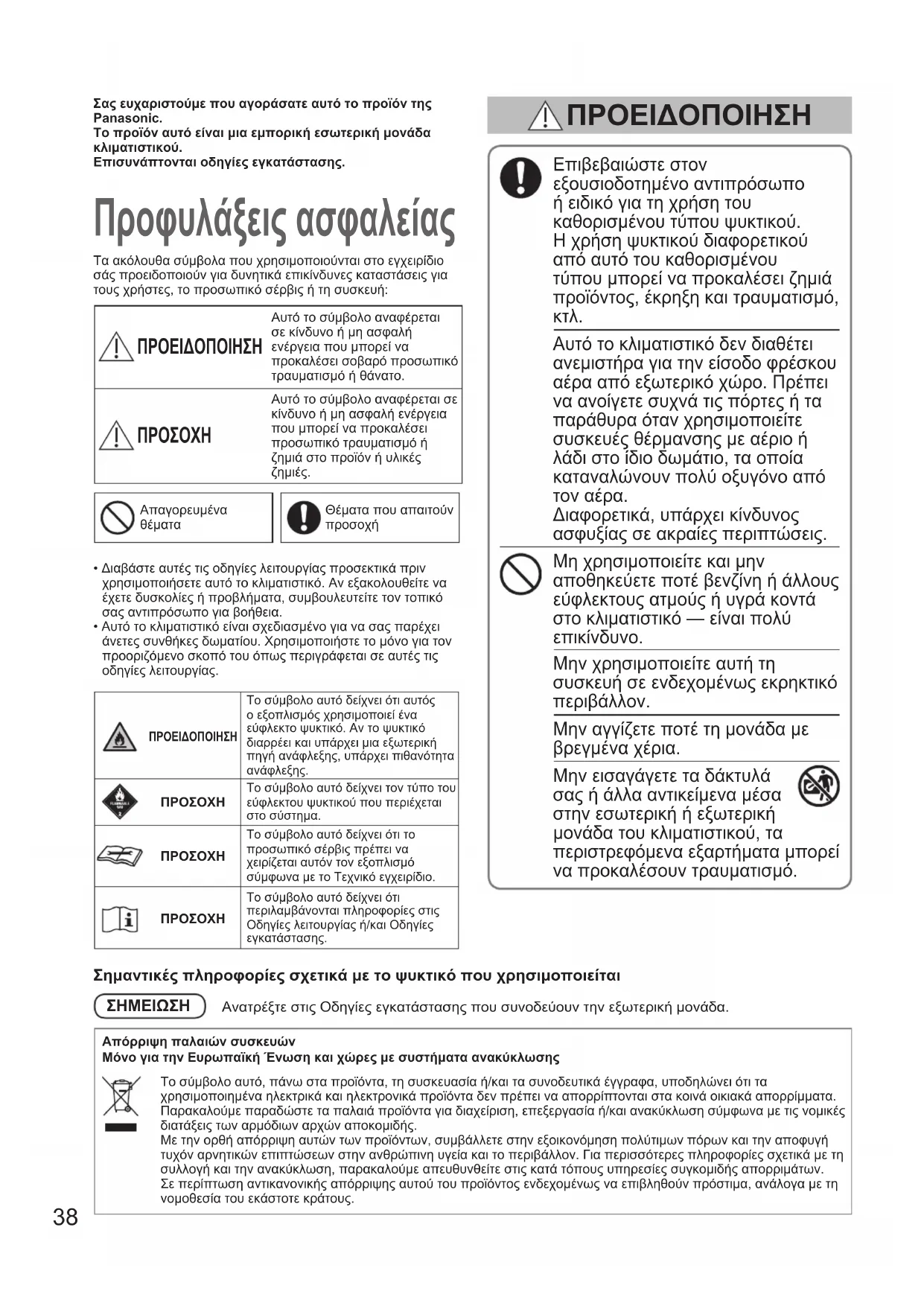 Διαφορετικά, υπάρχει κίνδυνος ασφυξίας σε ακραίες περιπτώσεις. Μη χρησιμοποιείτε και μην αποθηκεύετε ποτέ βενζίνη ή άλλους εύφλεκτους ατμούς ή υγρά κοντά στο κλιματιστικό — είναι πολύ επικίνδυνο. Μην χρησιμοποιείτε αυτή τη συσκευή σε ενδεχομένως εκρηκτικό περιβάλλον. Μην αγγίζετε ποτέ τη μονάδα με βρεγμένα χέρια. Μην εισαγάγετε τα δάκτυλά σας ή άλλα αντικείμενα μέσα στην εσωτερική ή εξωτερική μονάδα του κλιματιστικού, τα περιστρεφόμενα εξαρτήματα μπορεί να προκαλέσουν τραυματισμό. ΠΡΟΕΙΔΟΠΟΙΗΣΗ Προφυλάξεις ασφαλείας Τα ακόλουθα σύμβολα που χρησιμοποιούνται στο εγχειρίδιο σάς προειδοποιούν για δυνητικά επικίνδυνες καταστάσεις για τους χρήστες, το προσωπικό σέρβις ή τη συσκευή: ΠΡΟΕΙΔΟΠΟΙΗΣΗ Αυτό το σύμβολο αναφέρεται σε κίνδυνο ή μη ασφαλή ενέργεια που μπορεί να προκαλέσει σοβαρό προσωπικό τραυματισμό ή θάνατο.