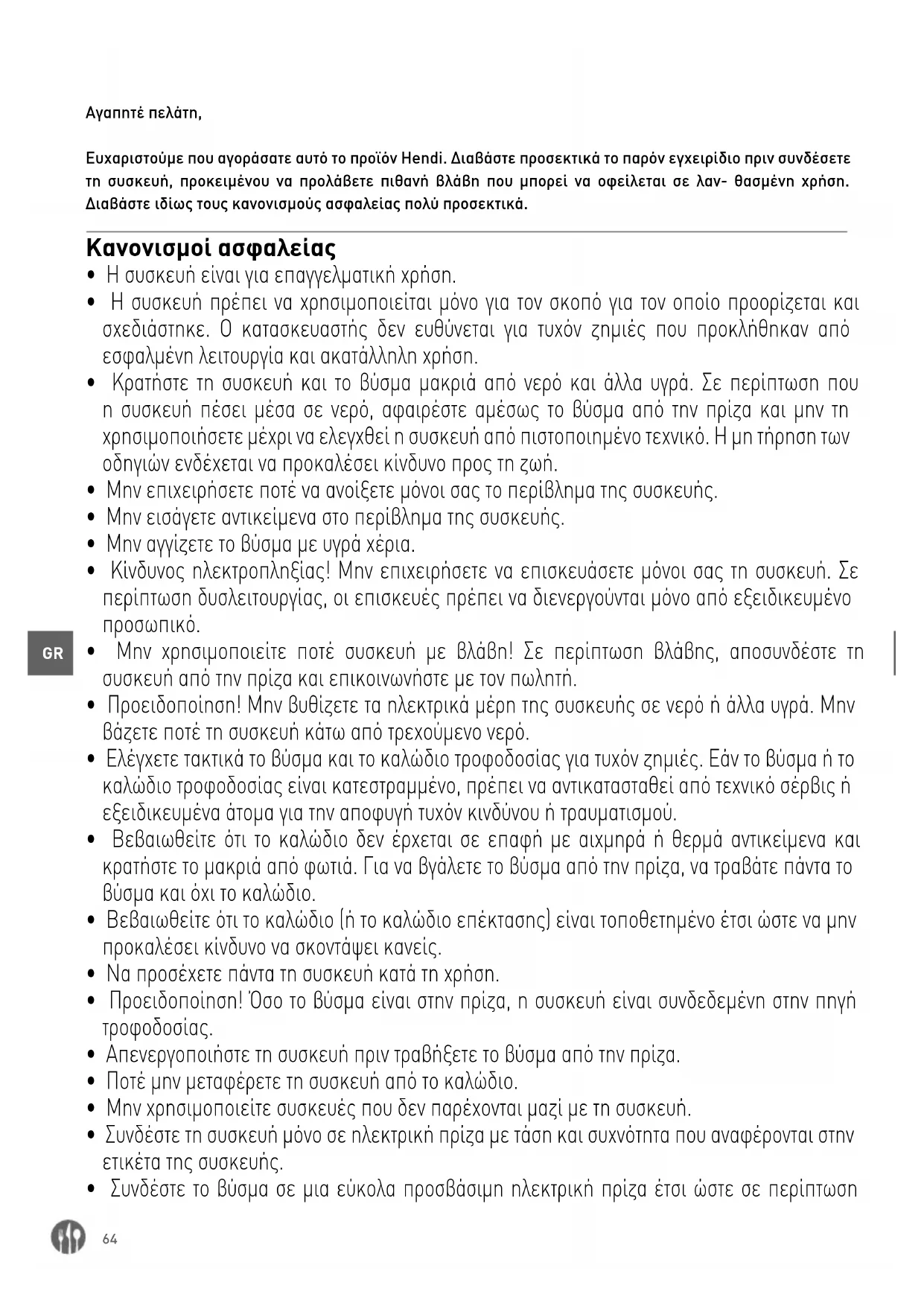 Αγαπητέ πελάτη, Ευχαριστούμε που αγοράσατε αυτό το προϊόν Hendi. Διαβάστε προσεκτικά το παρόν εγχειρίδιο πριν συνδέσετε τη συσκευή, προκειμένου να προλάβετε πιθανή βλάβη που μπορεί να οφείλεται σε λαν- θασμένη χρήση. Διαβάστε ιδίως τους κανονισμούς ασφαλείας πολύ προσεκτικά. Κανονισμοί ασφαλείας