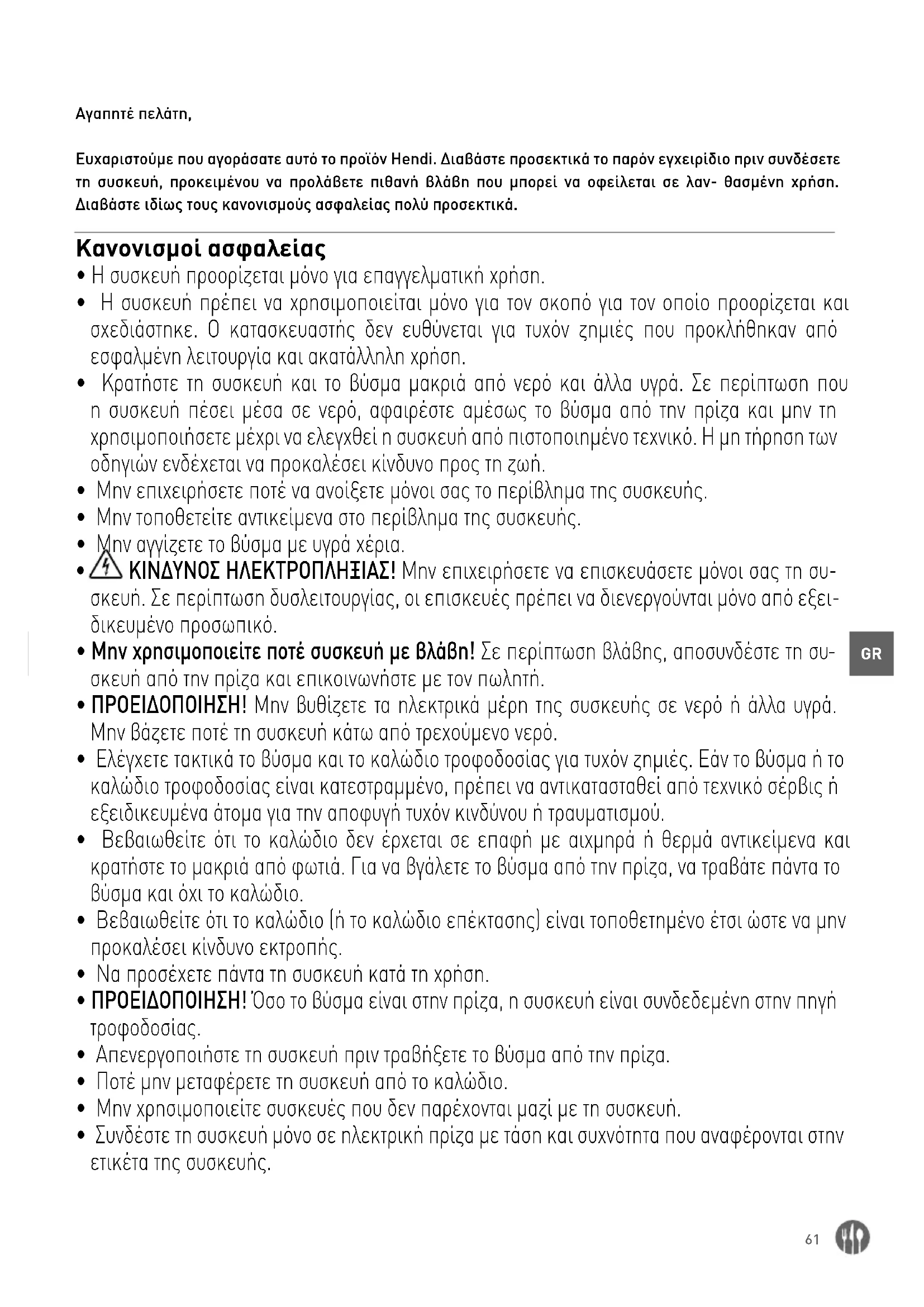 Αγαπητέ πελάτη, Ευχαριστούμε που αγοράσατε αυτό το προϊόν Hendi. Διαβάστε προσεκτικά το παρόν εγχειρίδιο πριν συνδέσετε τη συσκευή, προκειμένου να προλάβετε πιθανή βλάβη που μπορεί να οφείλεται σε λαν- θασμένη χρήση. Διαβάστε ιδίως τους κανονισμούς ασφαλείας πολύ προσεκτικά. Κανονισμοί ασφαλείας