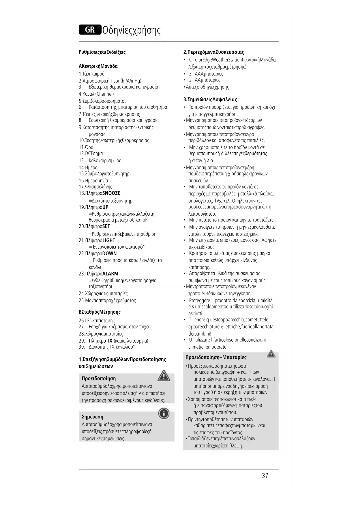 - Utilizzarel’articolo solo nelle condizioni climatiche moderate. Προειδοποίηση – Μπαταρίες