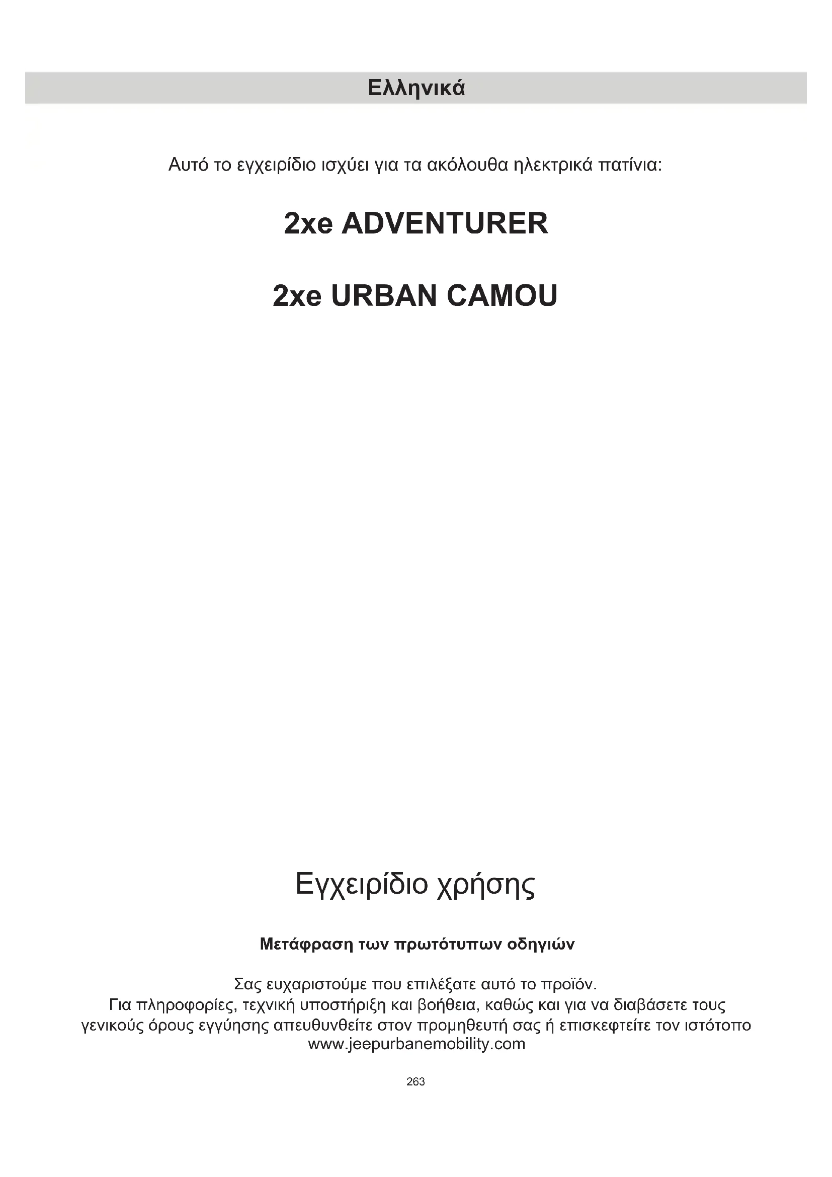 Εγχειρίδιο χρήσης Μετάφραση των πρωτότυπων οδηγιών Σας ευχαριστούμε που επιλέξατε αυτό το προϊόν. Για πληροφορίες, τεχνική υποστήριξη και βοήθεια, καθώς και για να διαβάσετε τους γενικούς όρους εγγύησης απευθυνθείτε στον προμηθευτή σας ή επισκεφτείτε τον ιστότοπο www.jeepurbanemobility.com