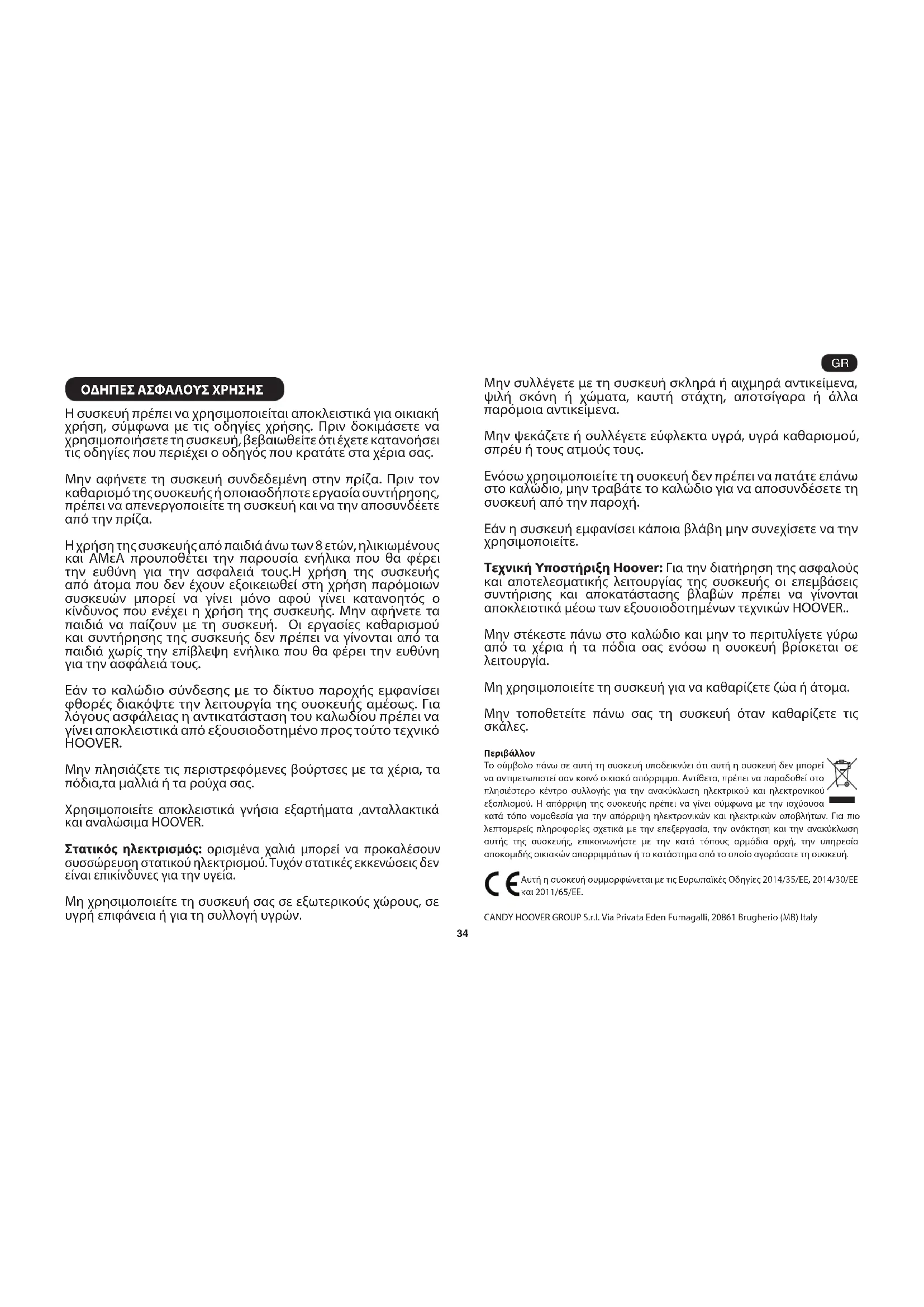 - Parkettisuulake* [Z] – Parketin ja muiden arkojen lattiapintojen imurointiin. TÄRKEÄÄ: Älä käytä mini turbosuulaketta imuroidessasi pitkähapsullisia mattoja, eläinten taljoja tai mattoja, joiden nukan pituus on yli 15 mm. Älä pidä suulaketta paikoillaan yhdessä kohdassa harjan pyöriessä.34 ΟΔΗΓΙΕΣ ΑΣΦΑΛΟΥΣ ΧΡΗΣΗΣ H συσκευή πρέπει να χρησιμοποιείται αποκλειστικά για οικιακή χρήση, σύμφωνα με τις οδηγίες χρήσης. Πριν δοκιμάσετε να χρησιμοποιήσετε τη συσκευή, βεβαιωθείτε ότι έχετε κατανοήσει τις οδηγίες που περιέχει ο οδηγός που κρατάτε στα χέρια σας. Μην αφήνετε τη συσκευή συνδεδεμένη στην πρίζα. Πριν τον καθαρισμό της συσκευής ή οποιασδήποτε εργασία συντήρησης, πρέπει να απενεργοποιείτε τη συσκευή και να την αποσυνδέετε από την πρίζα. Η χρήση της συσκευής από παιδιά άνω των 8 ετών, ηλικιωμένους και ΑΜεΑ προυποθέτει την παρουσία ενήλικα που θα φέρει την ευθύνη για την ασφαλειά τους.Η χρήση της συσκευής από άτομα που δεν έχουν εξοικειωθεί στη χρήση παρόμοιων συσκευών μπορεί να γίνει μόνο αφού γίνει κατανοητός ο κίνδυνος που ενέχει η χρήση της συσκευής. Μην αφήνετε τα παιδιά να παίζουν με τη συσκευή. Οι εργασίες καθαρισμού και συντήρησης της συσκευής δεν πρέπει να γίνονται από τα παιδιά χωρίς την επίβλεψη ενήλικα που θα φέρει την ευθύνη για την ασφάλειά τους. Εάν το καλώδιο σύνδεσης με το δίκτυο παροχής εμφανίσει φθορές διακόψτε την λειτουργία της συσκευής αμέσως. Για λόγους ασφάλειας η αντικατάσταση του καλωδίου πρέπει να γίνει αποκλειστικά από εξουσιοδοτημένο προς τούτο τεχνικό HOOVER. Μην πλησιάζετε τις περιστρεφόμενες βούρτσες με τα χέρια, τα πόδια,τα μαλλιά ή τα ρούχα σας. Χρησιμοποιείτε αποκλειστικά γνήσια εξαρτήματα ,ανταλλακτικά και αναλώσιμα HOOVER. Στατικός ηλεκτρισμός: ορισμένα χαλιά μπορεί να προκαλέσουν συσσώρευση στατικού ηλεκτρισμού. Τυχόν στατικές εκκενώσεις δεν είναι επικίνδυνες για την υγεία. Μη χρησιμοποιείτε τη συσκευή σας σε εξωτερικούς χώρους, σε υγρή επιφάνεια ή για τη συλλογή υγρών. Μην συλλέγετε με τη συσκευή σκληρά ή αιχμηρά αντικείμενα, ψιλή σκόνη ή χώματα, καυτή στάχτη, αποτσίγαρα ή άλλα παρόμοια αντικείμενα. Μην ψεκάζετε ή συλλέγετε εύφλεκτα υγρά, υγρά καθαρισμού, σπρέυ ή τους ατμούς τους. Ενόσω χρησιμοποιείτε τη συσκευή δεν πρέπει να πατάτε επάνω στο καλώδιο, μην τραβάτε το καλώδιο για να αποσυνδέσετε τη συσκευή από την παροχή. Εάν η συσκευή εμφανίσει κάποια βλάβη μην συνεχίσετε να την χρησιμοποιείτε. Τεχνική Υποστήριξη Hoover: Για την διατήρηση της ασφαλούς και αποτελεσματικής λειτουργίας της συσκευής οι επεμβάσεις συντήρισης και αποκατάστασης βλαβών πρέπει να γίνονται αποκλειστικά μέσω των εξουσιοδοτημένων τεχνικών HOOVER.. Μην στέκεστε πάνω στο καλώδιο και μην το περιτυλίγετε γύρω από τα χέρια ή τα πόδια σας ενόσω η συσκευή βρίσκεται σε λειτουργία. Μη χρησιμοποιείτε τη συσκευή για να καθαρίζετε ζώα ή άτομα. Μην τοποθετείτε πάνω σας τη συσκευή όταν καθαρίζετε τις