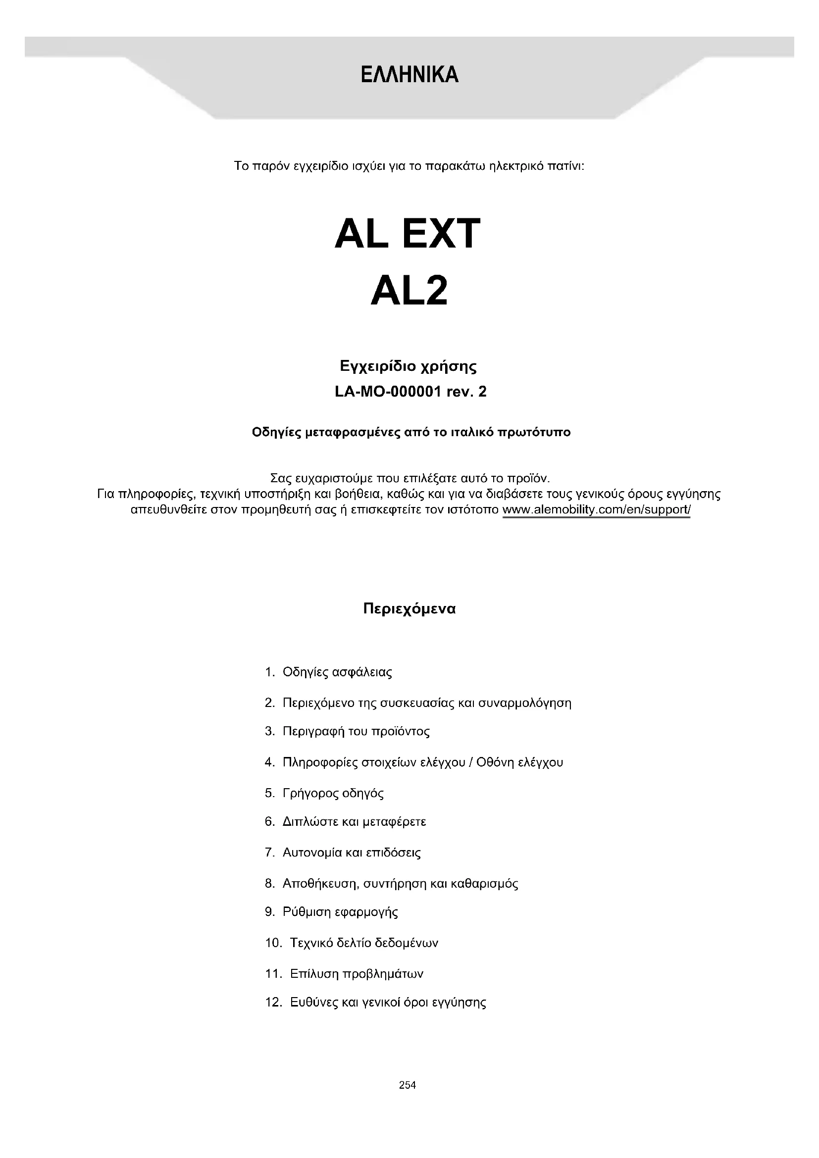 Συναρμολογήστε σωστά το προϊόν. Σε περίπτωση που, κατά τη συναρμολόγηση, διαπιστώσετε κάποιο εργοστασιακό ελάττωμα, κάποια ασάφεια ή δυσκολία ως προς τη συναρμολόγηση ή τις ρυθμίσεις, μην οδηγείτε το όχημα και επικοινωνήστε με τον προμηθευτή σας ή επισκεφθείτε τον ιστότοπο www.alemobility.com/en/ για να λάβετε τεχνική υποστήριξη. Μη χρησιμοποιείτε αξεσουάρ ή/και πρόσθετα εξαρτήματα που δεν είναι εγκεκριμένα από τον κατασκευαστή. Φυλάξτε τα παιδιά μακριά από πλαστικά μέρη (συμπεριλαμβανομένων των υλικών συσκευασίας) και μικρά εξαρτήματα για την αποφυγή του κινδύνου πνιγμού. Απαγορεύεται η τροποποίηση ή μετατροπή με οποιονδήποτε τρόπο του προϊόντος ή μερών αυτού, διότι ενδέχεται να επηρεαστεί η αποτελεσματικότητα και η δομή του και να προκληθούν ζημιές. Αν εντοπίσετε κάποιο εργοστασιακό ελάττωμα, αν διαπιστώσετε κάποιον ασυνήθιστο θόρυβο ή ανωμαλία, μην οδηγείτε το όχημα και επικοινωνήστε με τον προμηθευτή σας ή επισκεφθείτε τον ιστότοπο www.alemobility.com/en/ για να λάβετε τεχνική υποστήριξη.262 Με σκοπό τη συνεχή τεχνολογική εξέλιξη, η κατασκευάστρια εταιρεία διατηρεί το δικαίωμα να τροποποιεί το προϊόν χωρίς προειδοποίηση, δίχως να ενημερώνεται αυτόματα το παρόν εγχειρίδιο. Για πληροφορίες και για να δείτε τις αναθεωρήσεις του παρόντος εγχειριδίου επισκεφθείτε τον ιστότοπο www.alemobility.com/en/ AL EXT