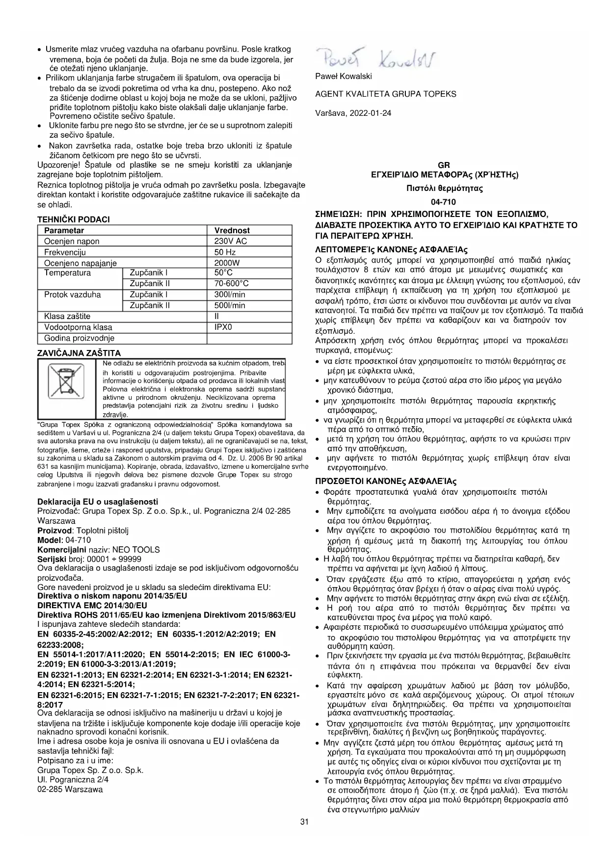Μην απορρίπτετε τα ηλεκτρικά προϊόντα με οικιακά απορρίμματα, θα πρέπει να χρησιμοποιούνται σε κατάλληλες εγκαταστάσεις. Λάβετε πληροφορίες σχετικά με τη χρήση αποβλήτων από τον πωλητή ή τις τοπικές αρχές σας. Ο χρησιμοποιημένος ηλεκτρικός και ηλεκτρονικός εξοπλισμός περιέχει ουσίες δραστικές στο φυσικό περιβάλλον. Ο μη κυκλικός εξοπλισμός αποτελεί δυνητικό κίνδυνο για το περιβάλλον και την ανθρώπινη υγεία. "Γκρούπα Τοπεξ Σπόλκα ζ ογκρανιζόνιε οντοουιντζιαλνόστ", Σπότκα κομαντίτοβα με έδρα τη Βαρσοβία στο ul. Το Pograniczna 2/4 (εφεξής Grupa Topex) ενημερώνει, ότι όλα τα πνευματικά δικαιώματα της παρούσας οδηγίας (εφεξής «Οδηγία»), συμπεριλαμβανομένων, ενδεικτικά, κειμένων, φωτογραφιών, συστημάτων, σχεδίων και διατάξεων της οδηγίας, ανήκουν αποκλειστικά στην Grupa Topex και προστατεύονται από νόμους ανάλογα με τον νόμο περί πνευματικών δικαιωμάτων και συγγενικών δικαιωμάτων της 4ης Φεβρουαρίου 2004 (ustawa o prawie autorskim i prawach pokrewnych, Dz. U. 2006 Αριθ. Η αντιγραφή, επεξεργασία, δημοσίευση, τροποποιήσεις για εμπορικούς σκοπούς ολόκληρης της Οδηγίας ή των μερών της χωρίς γραπτή άδεια της Grupa Topex απαγορεύονται αυστηρά και ενδέχεται να προκαλέσουν αστική και νομική ευθύνη. Δήλωση συμμόρφωσης ΕΕ Κατασκευαστής: Grupa Topex Sp. Ζ o.o. Σπ.κ., ul. Ρόκρανζνα 2/4 02- 285 Γουόρζαβα Προϊόν: Πιστόλι θερμότητας Μοντέλο: 04-710 Εμπορική ονομασία: ΝΕΟ ΕΡΓΑΛΕΙΑ Σειριακός αριθμός: 00001 ÷ 99999 Η παρούσα δήλωση συμμόρφωσης εκδίδεται με αποκλειστική ευθύνη του κατασκευαστή. Το προϊόν που αναφέρεται ανωτέρω είναι σύμφωνο με τις ακόλουθες οδηγίες της ΕΕ: Οδηγία χαμηλής τάσης 2014/35/ΕΕ Οδηγία EMC 2014/30/ΕΕ Οδηγία 2011/65/ΕΕ του RoHS, όπως τροποποιήθηκε με την οδηγία 2015/863/ΕΕ Και πληροί τις απαιτήσεις των ακόλουθων Προτύπων: EN 60335-2-45:2002/A2:2012· EN 60335-1:2012/A2:2019; EN 62233:2008·