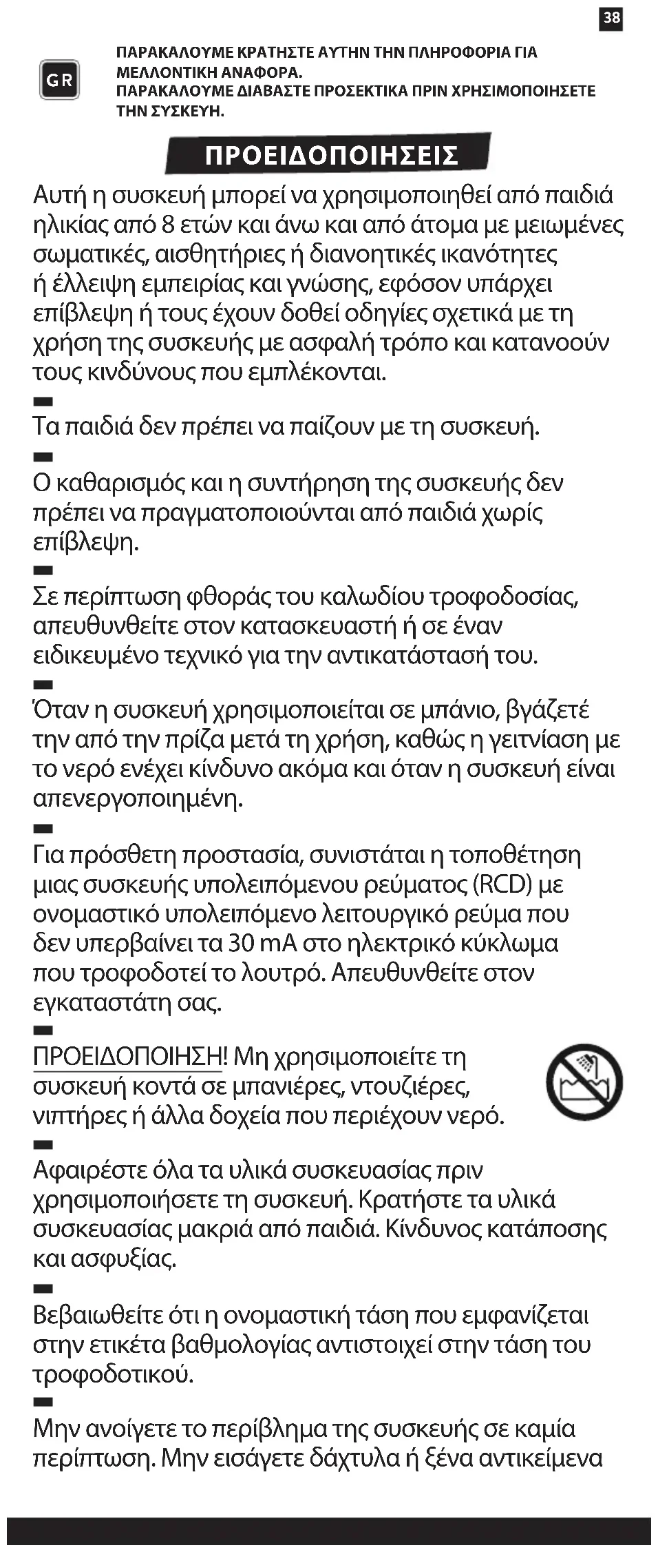 ΠΑΡΑΚΑΛΟΥΜΕ ΚΡΑΤΗΣΤΕ ΑΥΤΗΝ ΤΗΝ ΠΛΗΡΟΦΟΡΙΑ ΓΙΑ ΜΕΛΛΟΝΤΙΚΗ ΑΝΑΦΟΡΑ. ΠΑΡΑΚΑΛΟΥΜΕ ΔΙΑΒΑΣΤΕ ΠΡΟΣΕΚΤΙΚΑ ΠΡΙΝ ΧΡΗΣΙΜΟΠΟΙΗΣΕΤΕ ΤΗΝ ΣΥΣΚΕΥΗ. ΠΡΟΕΙΔΟΠΟΙΗΣΕΙΣ Αυτή η συσκευή μπορεί να χρησιμοποιηθεί από παιδιά ηλικίας από 8 ετών και άνω και από άτομα με μειωμένες σωματικές, αισθητήριες ή διανοητικές ικανότητες ή έλλειψη εμπειρίας και γνώσης, εφόσον υπάρχει επίβλεψη ή τους έχουν δοθεί οδηγίες σχετικά με τη χρήση της συσκευής με ασφαλή τρόπο και κατανοούν τους κινδύνους που εμπλέκονται. Τα παιδιά δεν πρέπει να παίζουν με τη συσκευή. Ο καθαρισμός και η συντήρηση της συσκευής δεν πρέπει να πραγματοποιούνται από παιδιά χωρίς