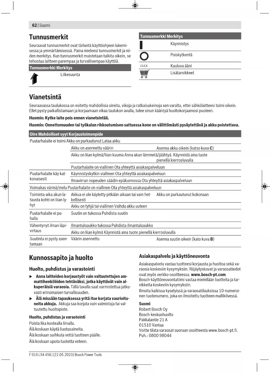 Αποφορτισμένη μπαταρία Φορτίστε την μπαταρία Bosch Power Tools F 016 L94 456 | (22.05.2023)68 | Ελληνικά Πρόβλημα Πιθανή αιτία Αντιμετώπιση Η μπαταρία δεν τοποθετήθηκε σωστά Σωστή τοποθέτηση της μπαταρίας (βλέπε εικόνα C) Πολύ κρύα ή πολύ ζεστή μπαταρία Αφήστε την μπαταρία να θερμανθεί / να κρυώσει. Εκκινείτε πάντα το προϊόν με χαμηλό αριθμό στρο-