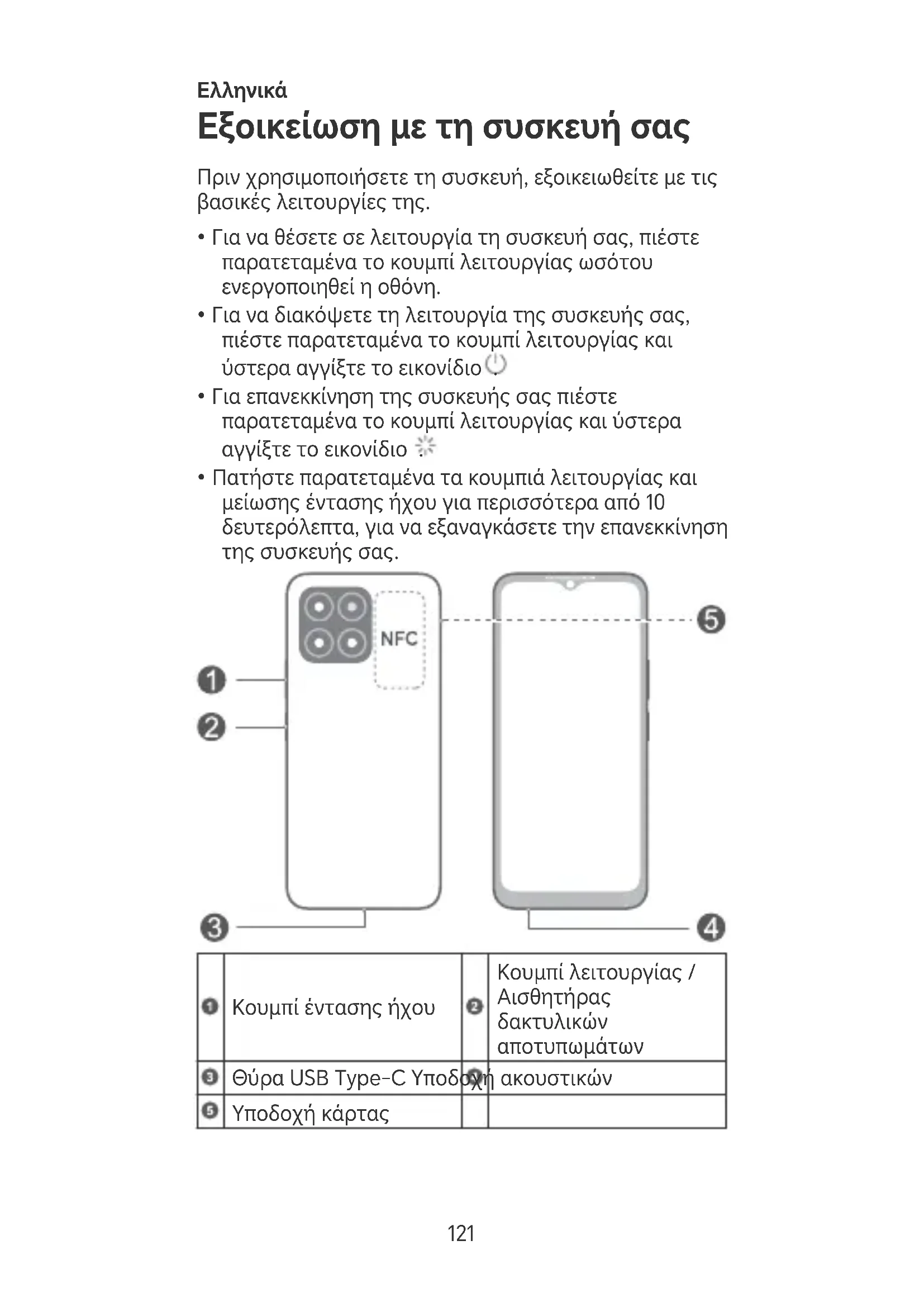 αποτυπωμάτων Θύρα USB Type-C Υποδοχή ακουστικών Υποδοχή κάρτας 121• Κατά τη χρήση της λειτουργίας NFC πρέπει να φέρνετε και να κρατάτε την περιοχή NFC κοντά σε άλλες συσκευές ή άλλα αντικείμενα.