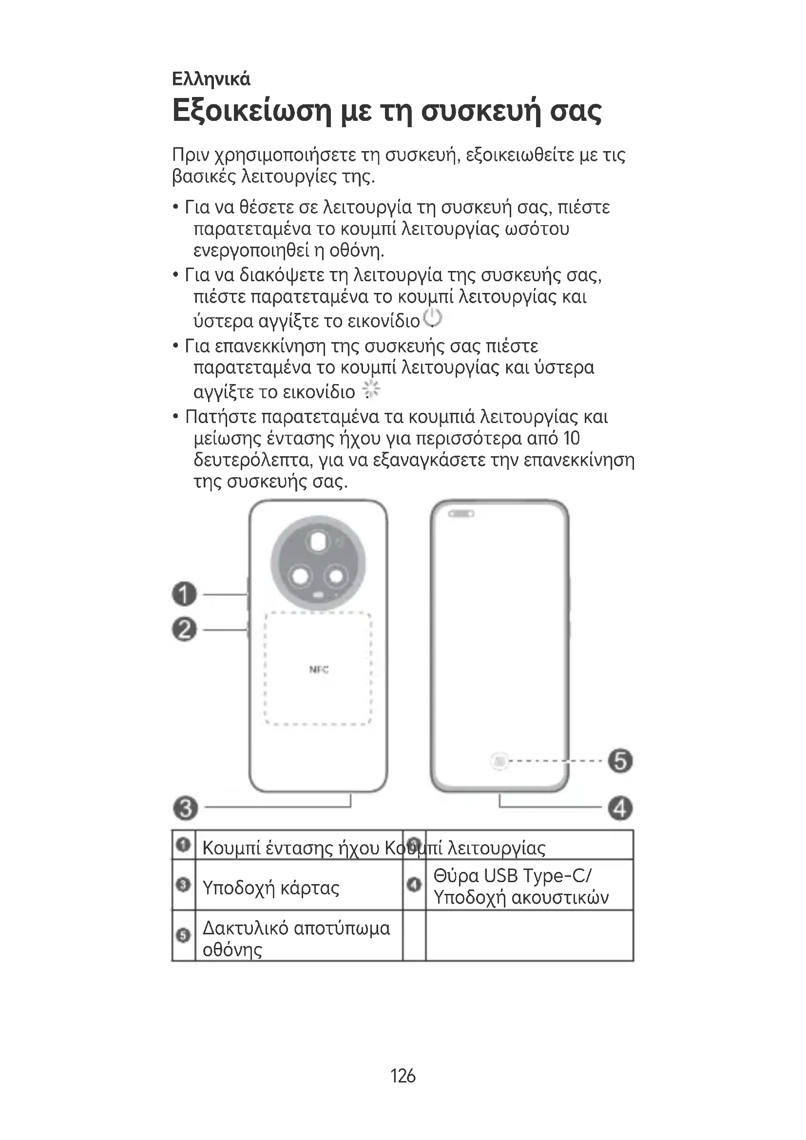 126• Κατά τη χρήση της λειτουργίας NFC πρέπει να φέρνετε και να κρατάτε την περιοχή NFC κοντά σε άλλες συσκευές ή άλλα αντικείμενα.