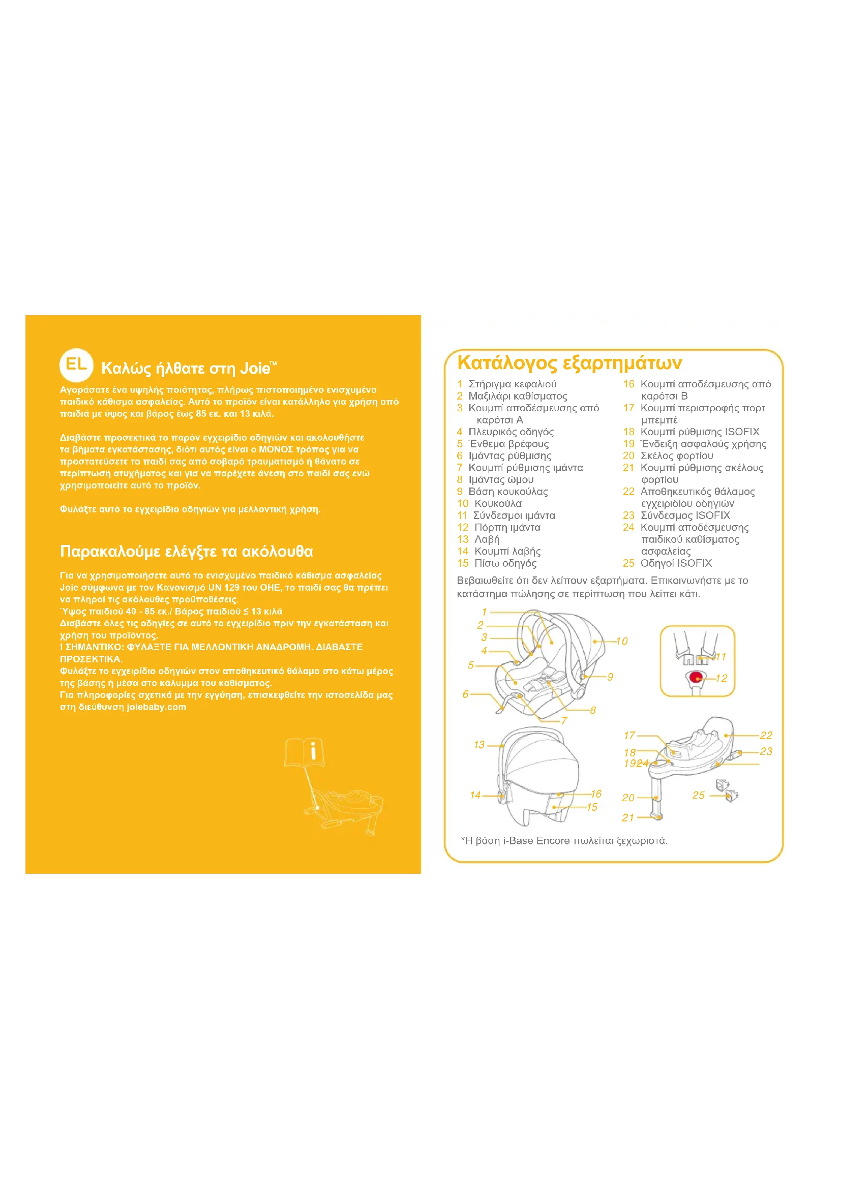 Αγοράσατε ένα υψηλής ποιότητας, πλήρως πιστοποιημένο ενισχυμένο παιδικό κάθισμα ασφαλείας. Αυτό το προϊόν είναι κατάλληλο για χρήση από παιδιά με ύψος και βάρος έως 85 εκ. και 13 κιλά.Διαβάστε προσεκτικά το παρόν εγχειρίδιο οδηγιών και ακολουθήστε τα βήματα εγκατάστασης, διότι αυτός είναι ο ΜΟΝΟΣ τρόπος για να προστατεύσετε το παιδί σας από σοβαρό τραυματισμό ή θάνατο σε περίπτωση ατυχήματος και για να παρέχετε άνεση στο παιδί σας ενώ χρησιμοποιείτε αυτό το προϊόν.Φυλάξτε αυτό το εγχειρίδιο οδηγιών για μελλοντική χρήση. Παρακαλούμε ελέγξτε τα ακόλουθα Για να χρησιμοποιήσετε αυτό το ενισχυμένο παιδικό κάθισμα ασφαλείας Joie σύμφωνα με τον Κανονισμό UN 129 του ΟΗΕ, το παιδί σας θα πρέπει να πληροί τις ακόλουθες προϋποθέσεις.Ύψος παιδιού 40 - 85 εκ./ Βάρος παιδιού ≤ 13 κιλάΔιαβάστε όλες τις οδηγίες σε αυτό το εγχειρίδιο πριν την εγκατάσταση και χρήση του προϊόντος.! ΣΗΜΑΝΤΙΚΟ: ΦΥΛΑΞΤΕ ΓΙΑ ΜΕΛΛΟΝΤΙΚΗ ΑΝΑΔΡΟΜΗ. ΔΙΑΒΑΣΤΕ ΠΡΟΣΕΚΤΙΚΑ.Φυλάξτε το εγχειρίδιο οδηγιών στον αποθηκευτικό θάλαμο στο κάτω μέρος της βάσης ή μέσα στο κάλυμμα του καθίσματος.Για πληροφορίες σχετικά με την εγγύηση, επισκεφθείτε την ιστοσελίδα μας στη διεύθυνση joiebaby.com *Η βάση i-Base Encore πωλείται ξεχωριστά.