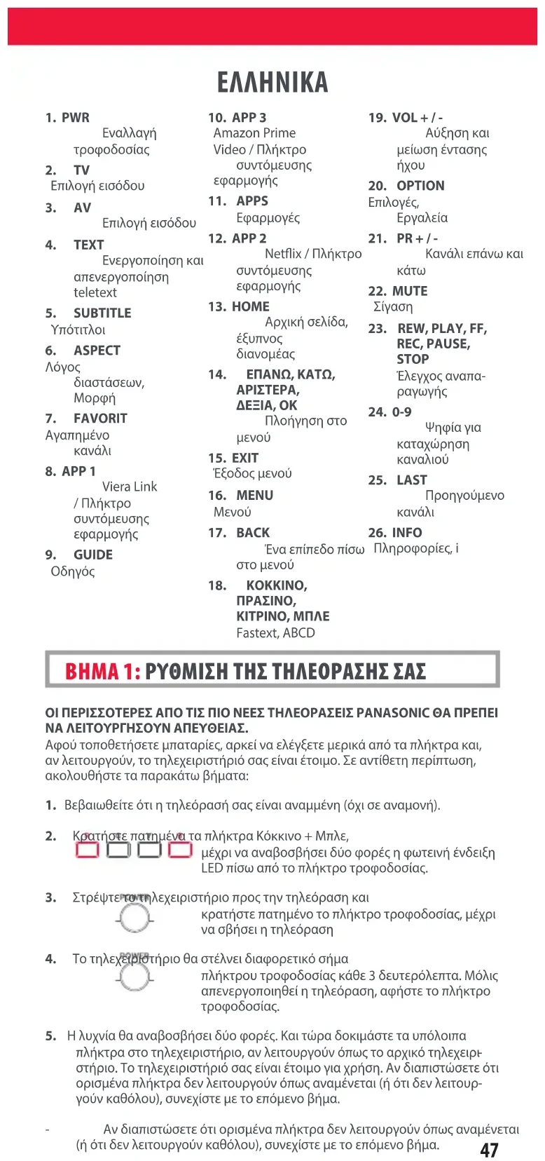 ΟΙ ΠΕΡΙΣΣΟΤΕΡΕΣ ΑΠΟ ΤΙΣ ΠΙΟ ΝΕΕΣ ΤΗΛΕΟΡΑΣΕΙΣ PANASONIC ΘΑ ΠΡΕΠΕΙ ΝΑ ΛΕΙΤΟΥΡΓΗΣΟΥΝ ΑΠΕΥΘΕΙΑΣ. Αφού τοποθετήσετε μπαταρίες, αρκεί να ελέγξετε μερικά από τα πλήκτρα και, αν λειτουργούν, το τηλεχειριστήριό σας είναι έτοιμο. Σε αντίθετη περίπτωση, ακολουθήστε τα παρακάτω βήματα: