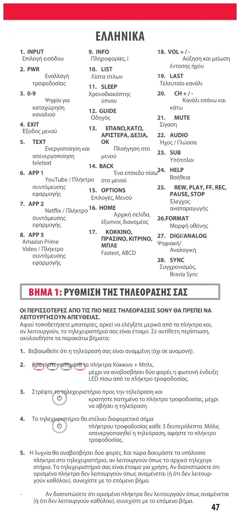 ΟΙ ΠΕΡΙΣΣΟΤΕΡΕΣ ΑΠΟ ΤΙΣ ΠΙΟ ΝΕΕΣ ΤΗΛΕΟΡΑΣΕΙΣ SONY ΘΑ ΠΡΕΠΕΙ ΝΑ ΛΕΙΤΟΥΡΓΗΣΟΥΝ ΑΠΕΥΘΕΙΑΣ. Αφού τοποθετήσετε μπαταρίες, αρκεί να ελέγξετε μερικά από τα πλήκτρα και, αν λειτουργούν, το τηλεχειριστήριό σας είναι έτοιμο. Σε αντίθετη περίπτωση, ακολουθήστε τα παρακάτω βήματα:
