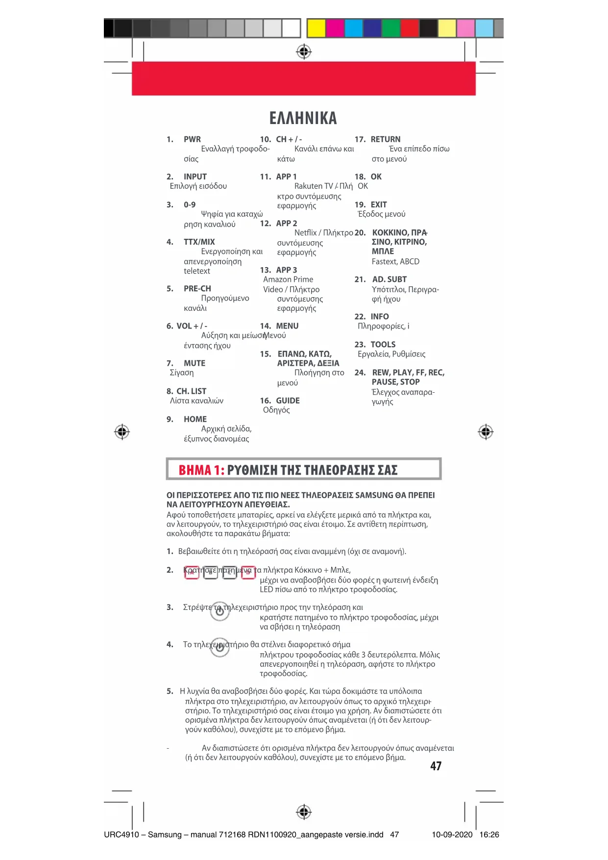ΒΗΜΑ 1: ΡΥΘΜΙΣΗ ΤΗΣ ΤΗΛΕΟΡΑΣΗΣ ΣΑΣ URC4910 – Samsung – manual 712168 RDN1100920_aangepaste versie.indd 47URC4910 – Samsung – manual 712168 RDN1100920_aangepaste versie.indd 47 10-09-2020 16:2610-09-2020 16:2648 ΜΑΘΕΤΕ ΜΙΑ ΝΕΑ ΛΕΙΤΟΥΡΓΙΑ ΣΤΟ ΤΗΛΕΧΕΙΡΙΣΤΗΡΙΟ ΣΑΣΤο τηλεχειριστήριό σας One For All μπορεί να μάθει μια λειτουργία από το αρχικό σας τηλεχειριστήριο (που λειτουργεί). Τοποθετήστε το αρχικό τηλεχειριστήριο ώστε να κοιτά το τηλεχειριστήριο One For All, επάνω σε μια επίπεδη επιφάνεια.2. Για την εκμάθηση: Κρατήστε πατημένα τα πλήκτρα ΠΡΑΣΙΝΟ + ΚΙΤΡΙΝΟ, μέχρι να αναβοσβήσουν δύο φορές οι φωτεινές ενδείξεις LED.3. Πατήστε 975. Το LED θα αναβοσβήσει δύο φορές.4. Πατήστε στο τηλεχειριστήριο One For All το πλήκτρο στο οποίο θέλετε να γίνει η εκμάθηση, για παράδειγμα το πλήκτρο VOL + Η λυχνία LED θα αναβοσβήσει γρήγορα.5. Πατήστε στο αρχικό τηλεχειριστήριο το πλήκτρο του οποίου θέλετε να γίνει η εκμάθηση, για παράδειγμα το πλήκτρο VOL + της συσκευής σας ήχου6. Δύο αναβοσβησίματα: OK. Επαναλάβετε από το βήμα 4 για εκμάθηση τυχόν επιπλέον πλήκτρων. Παρατεταμένο αναβοσβήσιμο: Προσπαθήστε ξανά, από το βήμα 4.7. Αφού ολοκληρώσετε την εκμάθηση όσων πλήκτρων χρειάζεστε, πατήστε και κρατήστε πατημένο το πλήκτρο OK για 3 δευτερό λεπτα. Το LED θα αναβοσβήσει δύο φορές.ΠΩΣ ΝΑ ΔΙΑΓΡΑΨΕΤΕ ΜΙΑ ΛΕΙΤΟΥΡΓΙΑ ΤΗΣ ΟΠΟΙΑΣ ΕΧΕΙ ΓΙΝΕΙ ΕΚΜΑΘΗΣΗ1. Κρατήστε πατημένα τα πλήκτρα ΠΡΑΣΙΝΟ + ΚΙΤΡΙΝΟ, μέχρι να αναβοσβή-σει δύο φορές η λυχνία LED.2. Πατήστε 976.3. Πατήστε το πλήκτρο για να γίνει επαναφορά δύο φορές.4. Η φωτεινή ένδειξη LED θα αναβοσβήσει δύο φορές και το πλήκτρο θα επανέλθει στην αρχική του λειτουργία.