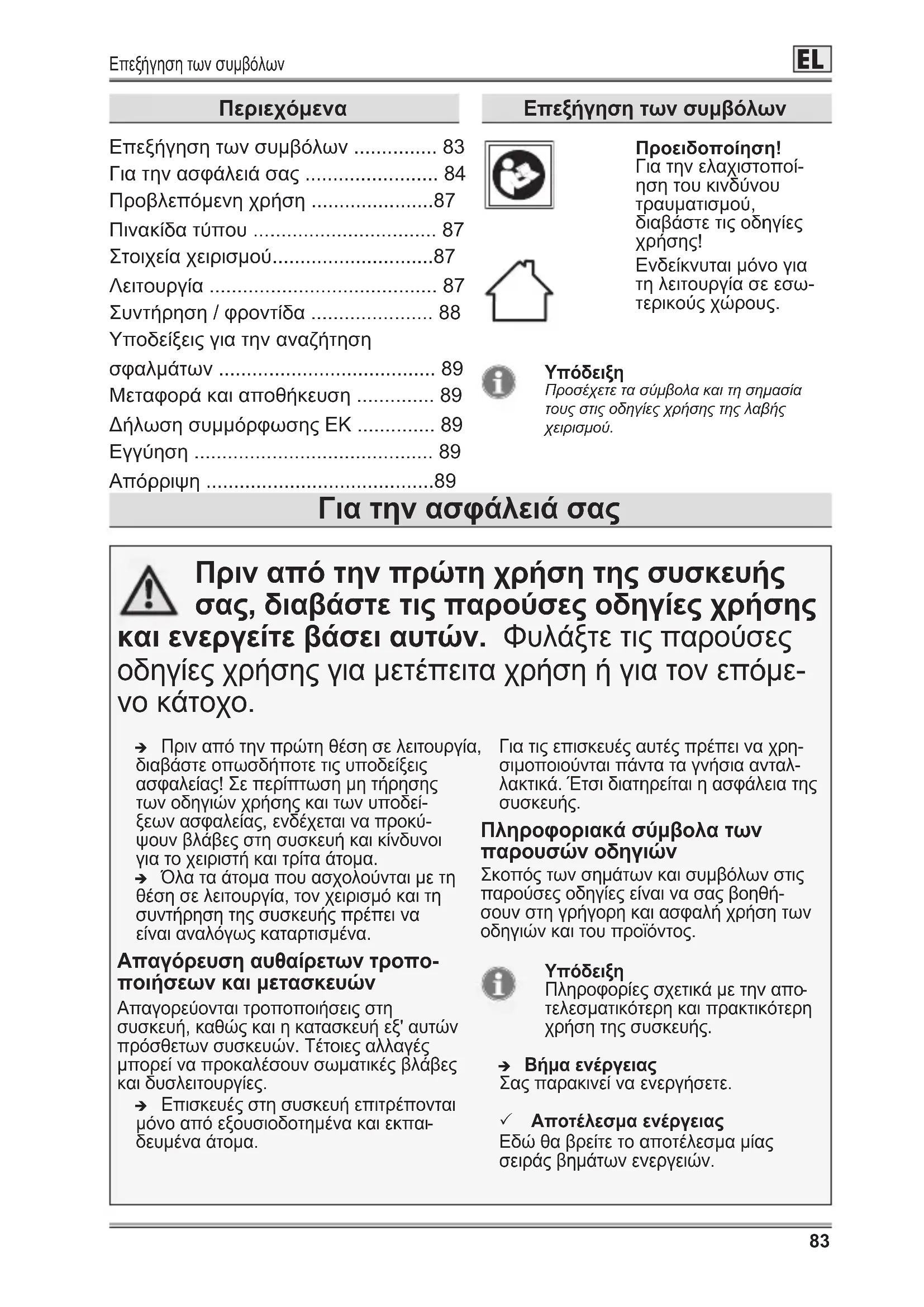 - Απόρριψη Επεξήγηση των συμβόλων Για την ασφάλειά σας Πριν από την πρώτη χρήση της συσκευής σας, διαβάστε τις παρούσες οδηγίες χρήσης και ενεργείτε βάσει αυτών. Φυλάξτε τις παρούσες οδηγίες χρήσης για μετέπειτα χρήση ή για τον επόμε p. 89