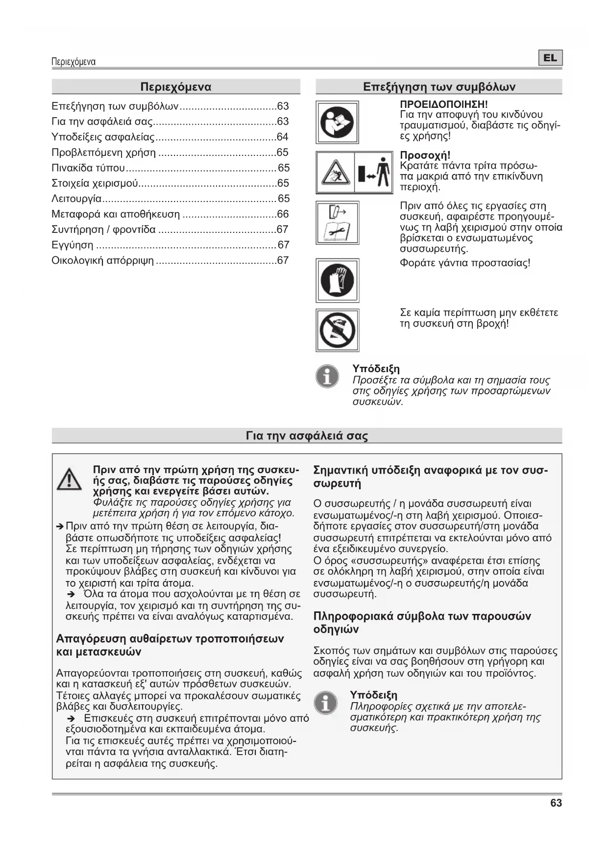 - Οικολογική απόρριψη Γιατηνασφάλειάσας Επεξήγησητωνσυμβόλων ΠΡΟΕΙΔΟΠΟΙΗΣΗ! Για την αποφυγή του κινδύνου τραυματισμού, διαβάστε τις οδηγί- p. 67