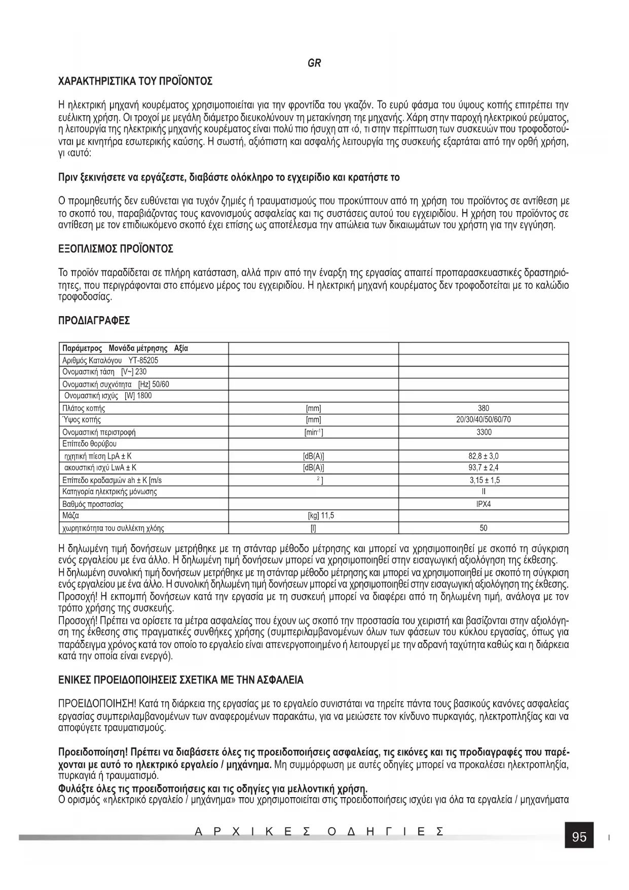 Πριν ξεκινήσετε να εργάζεστε, διαβάστε ολόκληρο το εγχειρίδιο και κρατήστε το Ο προμηθευτής δεν ευθύνεται για τυχόν ζημιές ή τραυματισμούς που προκύπτουν από τη χρήση του προϊόντος σε αντίθεση με το σκοπό του, παραβιάζοντας τους κανονισμούς ασφαλείας και τις συστάσεις αυτού του εγχειριδίου. Η χρήση του προϊόντος σε αντίθεση με τον επιδιωκόμενο σκοπό έχει επίσης ως αποτέλεσμα την απώλεια των δικαιωμάτων του χρήστη για την εγγύηση. ΕΞΟΠΛΙΣΜΟΣ ΠΡΟΪΟΝΤΟΣ Το προϊόν παραδίδεται σε πλήρη κατάσταση, αλλά πριν από την έναρξη της εργασίας απαιτεί προπαρασκευαστικές δραστηριό- τητες, που περιγράφονται στο επόμενο μέρος του εγχειριδίου. Η ηλεκτρική μηχανή κουρέματος δεν τροφοδοτείται με το καλώδιο τροφοδοσίας. ΠΡΟΔΙΑΓΡΑΦΕΣ Παράμετρος Μονάδα μέτρησης Αξία Αριθμός Καταλόγου YT-85205 Ονομαστική τάση [V~] 230 Ονομαστική συχνότητα [Hz] 50/60 Ονομαστική ισχύς [W] 1800 Πλάτος κοπής [mm] 380 Ύψος κοπής [mm] 20/30/40/50/60/70 Ονομαστική περιστροφή [min