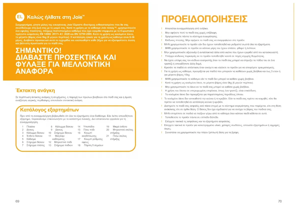 Συγχαρητήρια, γίνατε μέλος της οικογένειας Joie! Είμαστε ιδιαιτέρως ενθουσιασμένοι που θα σας συνοδεύουμε στη ζωή σας με το μικρό σας. Κατά τη χρήση με το κάθισμα Joie mimzy™, χρησιμοποιείτε ένα υψηλής ποιότητας, πλήρως πιστοποιημένο κάθισμα που έχει εγκριθεί σύμφωνα με τα Ευρωπαϊκά πρότυπα ασφαλείας EN 14988: 2017+ A1: 2020 και EN 12790:2009. Κατά τη χρήση ως κεκλιμένο λίκνο, το μέγιστο βάρος είναι 9kg (6 μηνών περίπου). Η κατάλληλη ηλικία για τη χρήση ως κάθισμα είναι 6-36 μήνες. Διαβάστε προσεκτικά αυτό το εγχειρίδιο και ακολουθήστε κάθε βήμα για να εξασφαλίσετε άνεση και βέλτιστη προστασία για το παιδί σας.