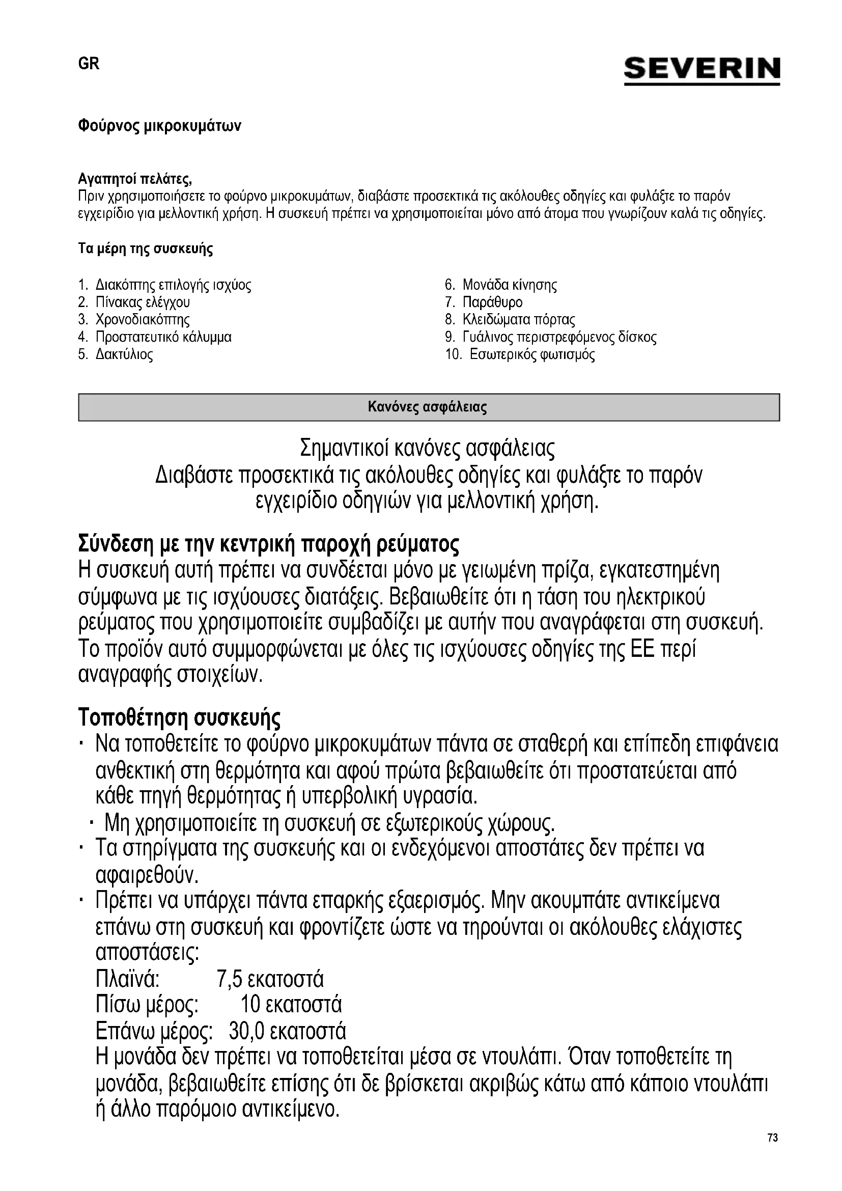 Κανόνες ασφάλειας Σημαντικοί κανόνες ασφάλειας Διαβάστε προσεκτικά τις ακόλουθες οδηγίες και φυλάξτε το παρόν εγχειρίδιο οδηγιών για μελλοντική χρήση. Σύνδεση με την κεντρική παροχή ρεύματος Η συσκευή αυτή πρέπει να συνδέεται μόνο με γειωμένη πρίζα, εγκατεστημένη σύμφωνα με τις ισχύουσες διατάξεις. Βεβαιωθείτε ότι η τάση του ηλεκτρικού ρεύματος που χρησιμοποιείτε συμβαδίζει με αυτήν που αναγράφεται στη συσκευή. Το προϊόν αυτό συμμορφώνεται με όλες τις ισχύουσες οδηγίες της ΕΕ περί αναγραφής στοιχείων. Τοποθέτηση συσκευής ∙ Να τοποθετείτε το φούρνο μικροκυμάτων πάντα σε σταθερή και επίπεδη επιφάνεια ανθεκτική στη θερμότητα και αφού πρώτα βεβαιωθείτε ότι προστατεύεται από κάθε πηγή θερμότητας ή υπερβολική υγρασία. ∙ Μη χρησιμοποιείτε τη συσκευή σε εξωτερικούς χώρους. ∙ Τα στηρίγματα της συσκευής και οι ενδεχόμενοι αποστάτες δεν πρέπει να αφαιρεθούν. ∙ Πρέπει να υπάρχει πάντα επαρκής εξαερισμός. Μην ακουμπάτε αντικείμενα επάνω στη συσκευή και φροντίζετε ώστε να τηρούνται οι ακόλουθες ελάχιστες αποστάσεις: Πλαϊνά: 7,5 εκατοστά Πίσω μέρος: 10 εκατοστά Επάνω μέρος: 30,0 εκατοστά Η μονάδα δεν πρέπει να τοποθετείται μέσα σε ντουλάπι. Όταν τοποθετείτε τη μονάδα, βεβαιωθείτε επίσης ότι δε βρίσκεται ακριβώς κάτω από κάποιο ντουλάπι ή άλλο παρόμοιο αντικείμενο.74 142 x 208 mm Σημαντικές πληροφορίες ∙ Προσοχή: Ορισμένοι τύποι τροφίμων έχουν την τάση να αναφλέγονται. Μην αφήνετε τη συσκευή χωρίς επιτήρηση κατά τη χρήση της. ∙ Αυτός ο φούρνος μικροκυμάτων προορίζεται μόνο για απόψυξη, ζέσταμα και μαγείρεμα φαγητού. Προσοχή: Οποιαδήποτε απόπειρα να ξηράνετε τρόφιμα ή να στεγνώσετε ρούχα, να θερμάνετε θερμαντικά μαξιλάρια, παντόφλες, σπόγγους, υγρά ρούχα καθαρισμού, κτλ. μπορεί να προκαλέσει τραυματισμούς, καύση ή πυρκαγιά. ∙ Δεν αναλαμβάνουμε καμία ευθύνη για το ενδεχόμενο πρόκλησης ζημιάς από λανθασμένη χρήση της συσκευής ή σε περίπτωση μη τήρησης αυτών των