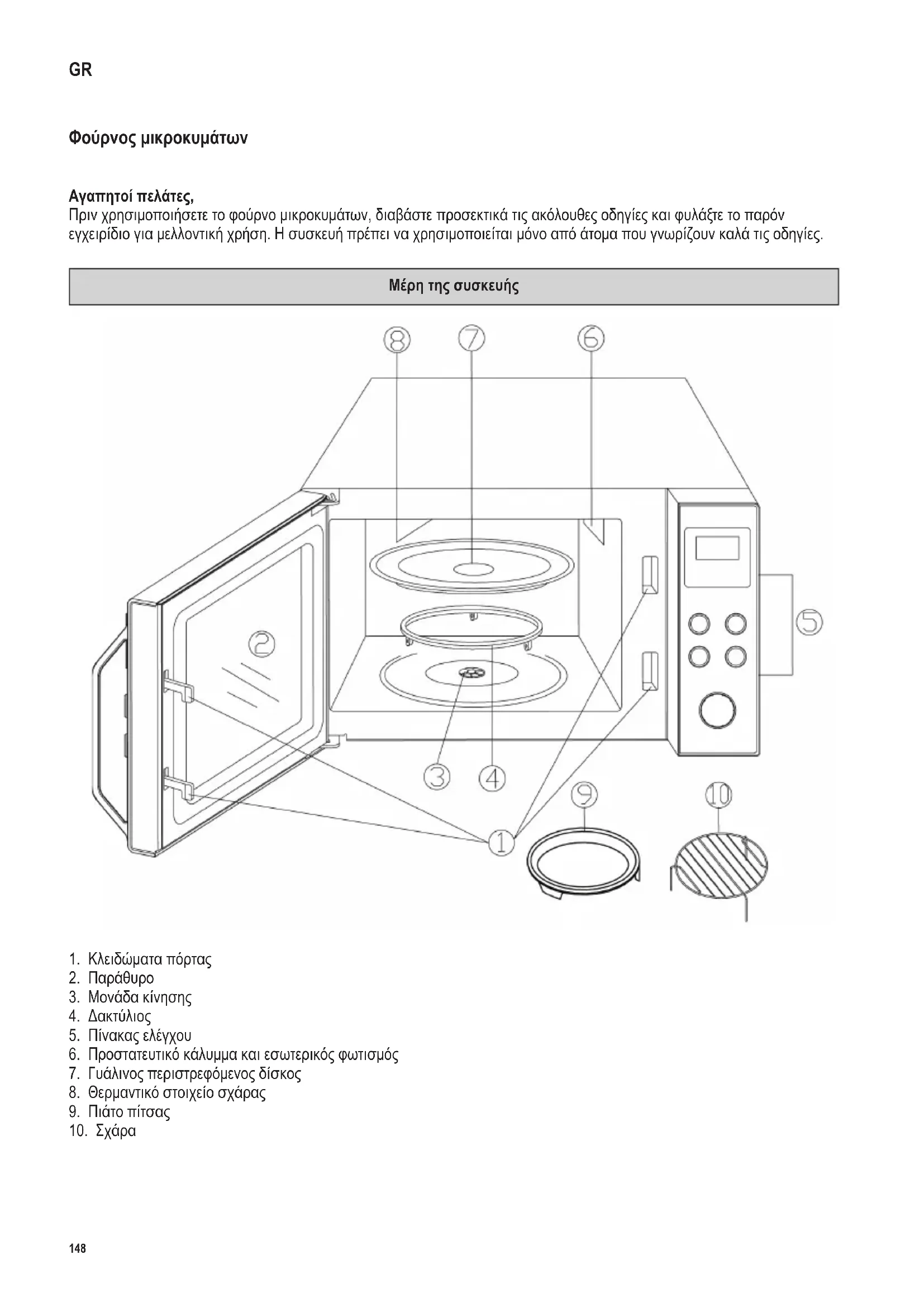 Οι συσκευές με αυτό το σύμβολο πρέπει να απορριφθούν ξεχωριστά από τα οικιακά απόβλητα, επειδή περιέχουν πολύτιμα υλικά που μπορούν να ανακυκλωθούν. Η σωστή διάθεση προστατεύει το περιβάλλον και την ανθρώπινη υγεία. Θα βρείτε πληροφορίες για το συγκεκριμένο θέμα από την τοπική σας αρμόδια αρχή ή έμπορο λιανικής.164 142 x 208 mm Микроволноваяпечь Уважаемыйпокупатель! Прежде чем приступить к эксплуатации микроволновой печи, внимательно прочитайте данное руководство по эксплуатации и держите его под рукой, так как оно может понадобиться в будущем. Этот электроприбор могут использовать только лица, ознакомившиеся с данным руководством. Устройствоприбора