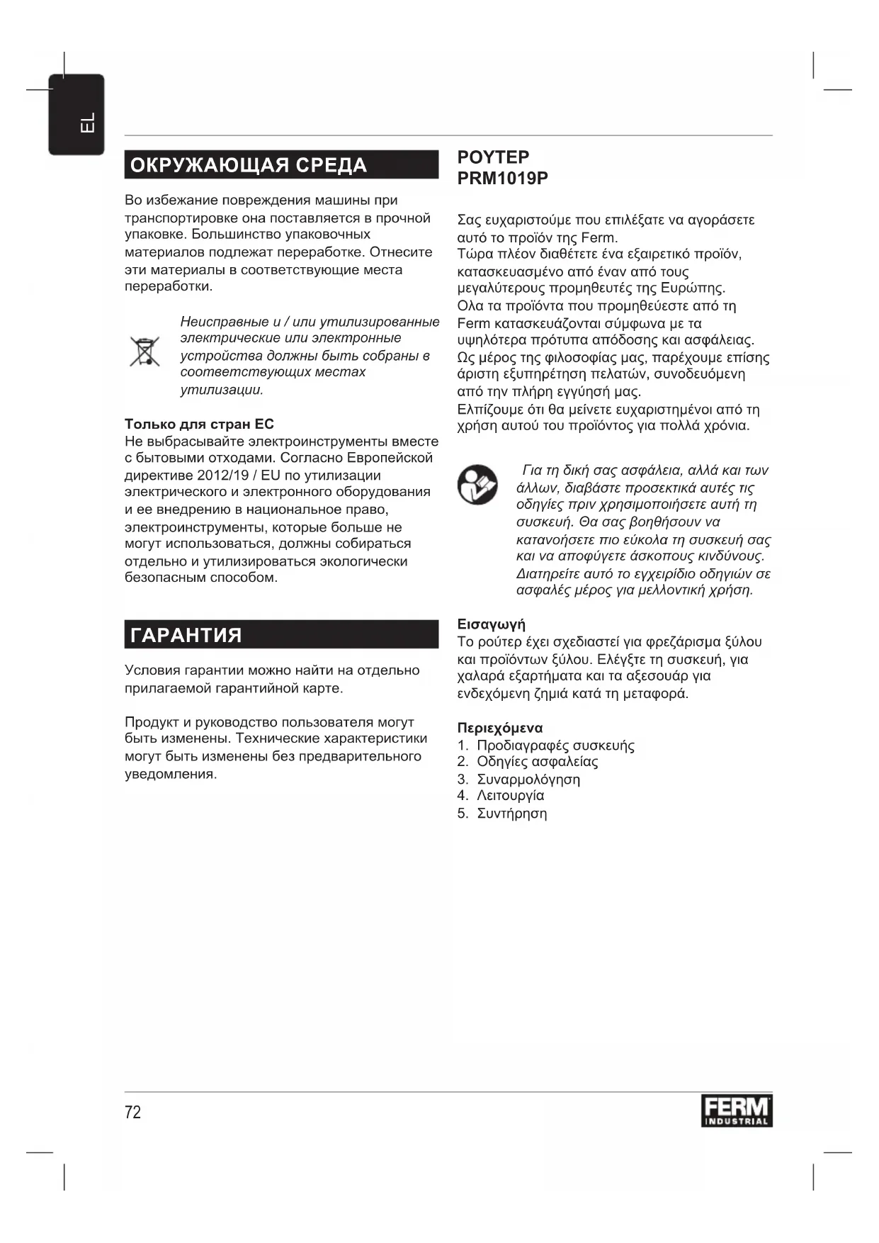 PRM1019P Σας ευχαριστούμε που επιλέξατε να αγοράσετε αυτό το προϊόν της Ferm. Τώρα πλέον διαθέτετε ένα εξαιρετικό προϊόν, κατασκευασμένο από έναν από τους μεγαλύτερους προμηθευτές της Ευρώπης. Ολα τα προϊόντα που προμηθεύεστε από τη Ferm κατασκευάζονται σύμφωνα με τα υψηλότερα πρότυπα απόδοσης και ασφάλειας. Ως μέρος της φιλοσοφίας μας, παρέχουμε επίσης άριστη εξυπηρέτηση πελατών, συνοδευόμενη από την πλήρη εγγύησή μας. Ελπίζουμε ότι θα μείνετε ευχαριστημένοι από τη χρήση αυτού του προϊόντος για πολλά χρόνια. Για τη δική σας ασφάλεια, αλλά και των άλλων, διαβάστε προσεκτικά αυτές τις οδηγίες πριν χρησιμοποιήσετε αυτή τη συσκευή. Θα σας βοηθήσουν να κατανοήσετε πιο εύκολα τη συσκευή σας και να αποφύγετε άσκοπους κινδύνους. Διατηρείτε αυτό το εγχειρίδιο οδηγιών σε ασφαλές μέρος για μελλοντική χρήση.
