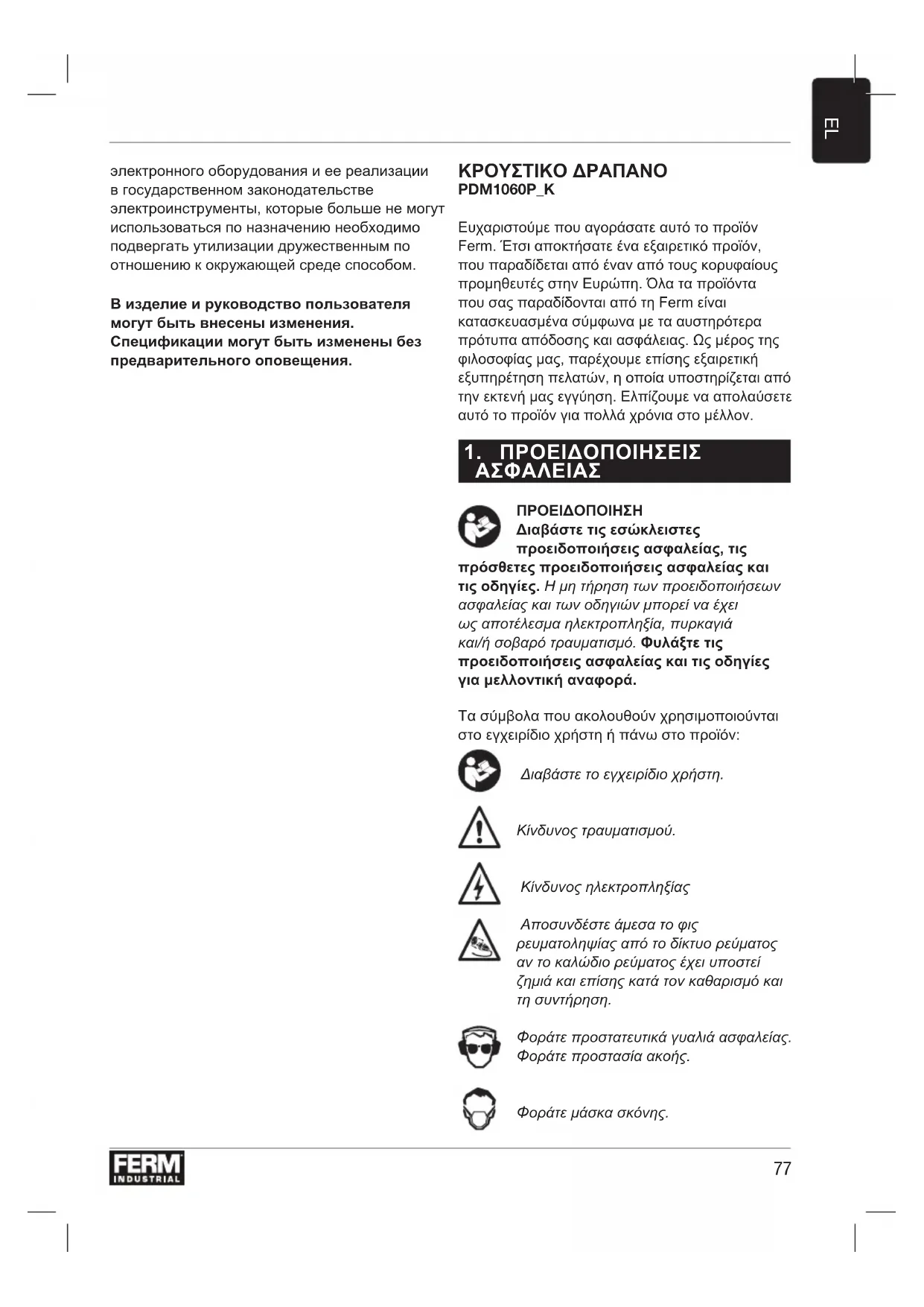 Κατεβάστε τις οδηγίες για το τρυπάνι σε μορφή PDF δωρεάν! Βρείτε το εγχειρίδιό σας PDM1060P_K - Ferm και πάρτε ξανά την ηλεκτρονική σας συσκευή στα χέρια σας. Σε αυτή τη σελίδα δημοσιεύονται όλα τα έγγραφα που απαιτούνται για τη χρήση της συσκευής σας. PDM1060P_K της μάρκας Ferm.
