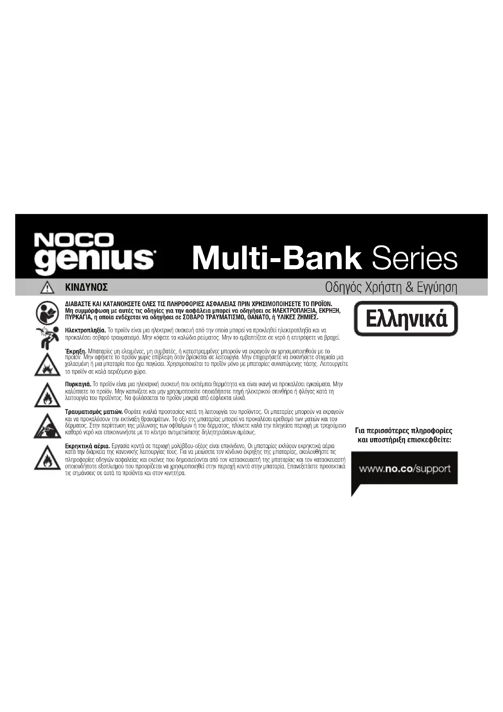ΔΙΑΒΑΣΤΕ ΚΑΙ ΚΑΤΑΝΟΗΣΕΤΕ ΟΛΕΣ ΤΙΣ ΠΛΗΡΟΦΟΡΙΕΣ ΑΣΦΑΛΕΙΑΣ ΠΡΙΝ ΧΡΗΣΙΜΟΠΟΙΗΣΕΤΕ ΤΟ ΠΡΟΪΟΝ. Μη συμμόρφωση με αυτές τις οδηγίες για την ασφάλεια μπορεί να οδηγήσει σε ΗΛΕΚΤΡΟΠΛΗΞΙΑ, ΕΚΡΗΞΗ, ΠΥΡΚΑΓΙΑ, η οποία ενδέχεται να οδηγήσει σε ΣΟΒΑΡΟ ΤΡΑΥΜΑΤΙΣΜΟ, ΘΑΝΑΤΟ, ή ΥΛΙΚΕΣ ΖΗΜΙΕΣ. Ηλεκτροπληξία. Το προϊόν είναι μια ηλεκτρική συσκευή από την οποία μπορεί να προκληθεί ηλεκτροπληξία και να προκαλέσει σοβαρό τραυματισμό. Μην κόψετε τα καλώδια ρεύματος. Μην τo εμβαπτίζετε σε νερό ή επιτρέψετε να βραχεί. Έκρηξη. Μπαταρίες μη ελεγμένες, μη συμβατές, ή κατεστραμμένες μπορούν να εκραγούν αν χρησιμοποιηθούν με το προϊόν. Μην αφήνετε το προϊόν χωρίς επίβλεψη όταν βρίσκεται σε λειτουργία. Μην επιχειρήσετε να εκκινήσετε στιγμιαία μια χαλασμένη ή μια μπαταρία που έχει παγώσει. Χρησιμοποιείται το προϊόν μόνο με μπαταρίες συνιστώμενης τάσης. Λειτουργείτε το προϊόν σε καλά αεριζόμενο χώρο. Πυρκαγιά. Το προϊόν είναι μια ηλεκτρική συσκευή που εκπέμπει θερμότητα και είναι ικανή να προκαλέσει εγκαύματα. Μην καλύπτετε το προϊόν. Μην καπνίζετε και μην χρησιμοποιείτε οποιαδήποτε πηγή ηλεκτρικού σπινθήρα ή φλόγας κατά τη λειτουργία του προϊόντος. Να φυλάσσεται το προϊόν μακριά από εύφλεκτα υλικά. Τραυματισμός ματιών. Φοράτε γυαλιά προστασίας κατά τη λειτουργία του προϊόντος. Οι μπαταρίες μπορούν να εκραγούν και να προκαλέσουν την εκτίναξη θραυσμάτων. Το οξύ της μπαταρίας μπορεί να προκαλέσει ερεθισμό των ματιών και του δέρματος. Στην περίπτωση της μόλυνσης των οφθαλμών ή του δέρματος, πλύνετε καλά την πληγείσα περιοχή με τρεχούμενο καθαρό νερό και επικοινωνήστε με το κέντρο αντιμετώπισης δηλητηριάσεων.αμέσως. Εκρηκτικά αέρια. Εργασία κοντά σε περιοχή μολύβδου-οξέος είναι επικίνδυνο. Οι μπαταρίες εκλύουν εκρηκτικά αέρια κατά την διάρκεια της κανονικής λειτουργίας τους. Για να μειώσετε τον κίνδυνο έκρηξης της μπαταρίας, ακολουθήστε τις πληροφορίες οδηγιών ασφαλείας και εκείνες που δημοσιεύονται από τον κατασκευαστή της μπαταρίας και τον κατασκευαστή οποιουδήποτε εξοπλισμού που προορίζεται να χρησιμοποιηθεί στην περιοχή κοντά στην μπαταρία. Επανεξετάστε προσεκτικά τις σημάνσεις σε αυτά τα προϊόντα και στον κινητήρα. Για περισσότερες πληροφορίες και υποστήριξη επισκεφθείτε: Multi-Bank Series ΕλληνικάΣχετικά με το Genius Multi-Bank. Ο NOCO Genius Multi-Bank αντιπροσωπεύει μία από τις πιο προηγμένες τεχνολογίες της αγοράς, κάνοντας κάθε φόρτιση απλή και εύκολη. Είναι πολύ πιθανό να είναι ο πιο ασφαλής φορτιστής που θα χρησιμοποιήσετε ποτέ. Η σειρά πολλαπλών συστοιχιών Genius είναι σχεδιασμένη για όλους τους τύπους μπαταριών μολύβδου-οξέως 6V & 12V, συμπεριλαμβανομένων των Wet (Flooded), Gel, MF (Κλειστού Τύπου), CA (Ασβεστίου), EFB (Enhanced Flooded Battery), και AGM (Absorption Glass Mat), όπως επίσης και για τις μπαταρίες 12V Λιθίου (LiFePO4). Είναι κατάλληλη για φόρτιση μπαταριών χωρητικότητας έως και 40 Αμπερωρίων και συντηρεί μπαταρίες όλων των μεγεθών. Έναρξη. Προτού χρησιμοποιήσετε τον φορτιστή, διαβάστε προσεκτικά τις ειδικές προφυλάξεις και τις συνιστώμενες τιμές φόρτισης που προτείνει ο κατασκευαστής της μπαταρίας. Βεβαιωθείτε για την τάση και τη χημική σύσταση της μπαταρίας, ανατρέχοντας στο εγχειρίδιο του κατασκευαστή της μπαταρίας προτού κάνετε τη φόρτιση. Τοποθέτηση. Είναι σημαντικό να προσέξετε την απόσταση μέχρι την μπαταρία. Το μήκος του καλωδίου DC από τον φορτιστή, είτε με ακροδέκτη σφιγκτήρα μπαταρί
