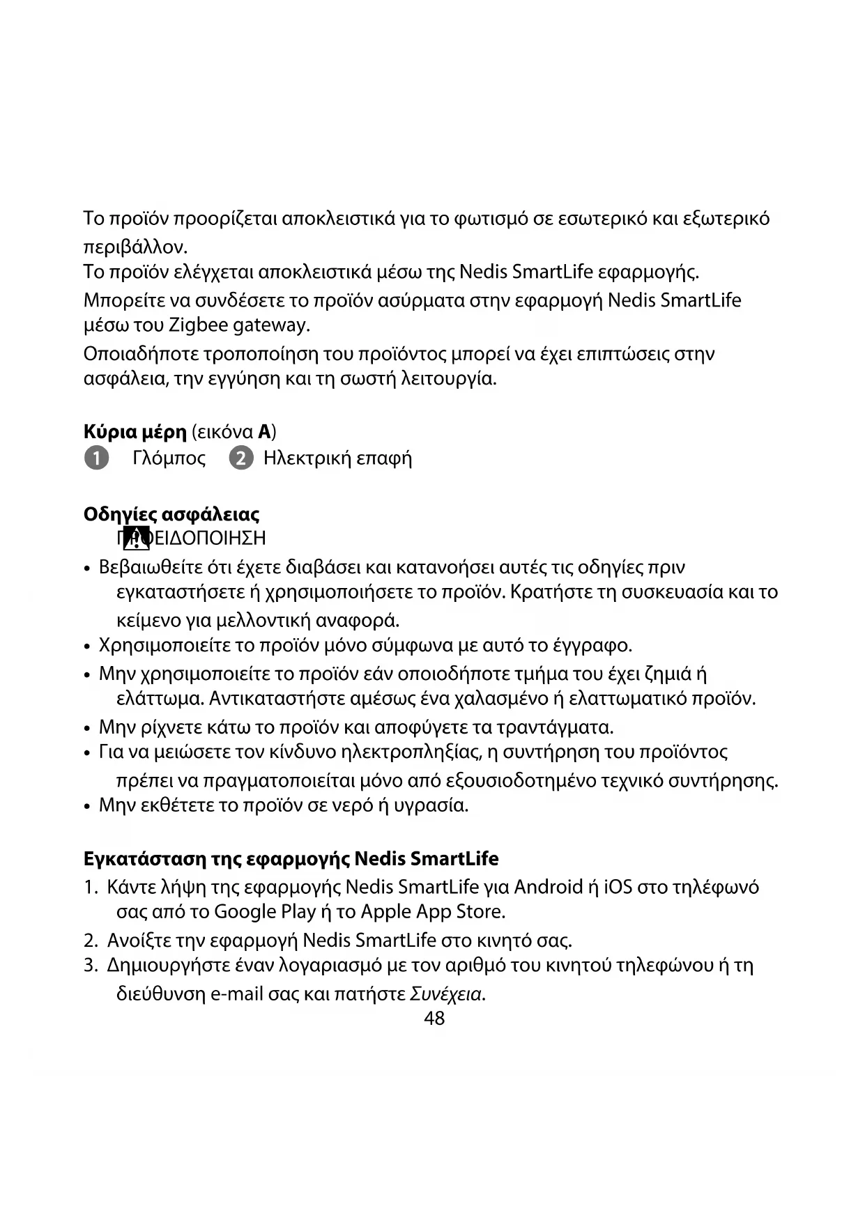 Για περισσότερες πληροφορίες δείτε το εκτενές online εγχειρίδιο: ned.is/zblc10e14 | ned.is/zblc10e27 | ned.is/zblc10gu10 Προοριζόμενη χρήση Το Nedis ZBLC10E14 | ZBLC10E27 | ZBLC10GU10 είναι μία λάμπα που μπορείτε να ελέγξετε ασύρματα τον φωτισμό.48 Το προϊόν προορίζεται αποκλειστικά για το φωτισμό σε εσωτερικό και εξωτερικό περιβάλλον. Το προϊόν ελέγχεται αποκλειστικά μέσω της Nedis SmartLife εφαρμογής. Μπορείτε να συνδέσετε το προϊόν ασύρματα στην εφαρμογή Nedis SmartLife μέσω του Zigbee gateway. Οποιαδήποτε τροποποίηση του προϊόντος μπορεί να έχει επιπτώσεις στην ασφάλεια, την εγγύηση και τη σωστή λειτουργία. Κύρια μέρη (εικόνα A) 1 Γλόμπος 2 Ηλεκτρική επαφή Οδηγίες ασφάλειας