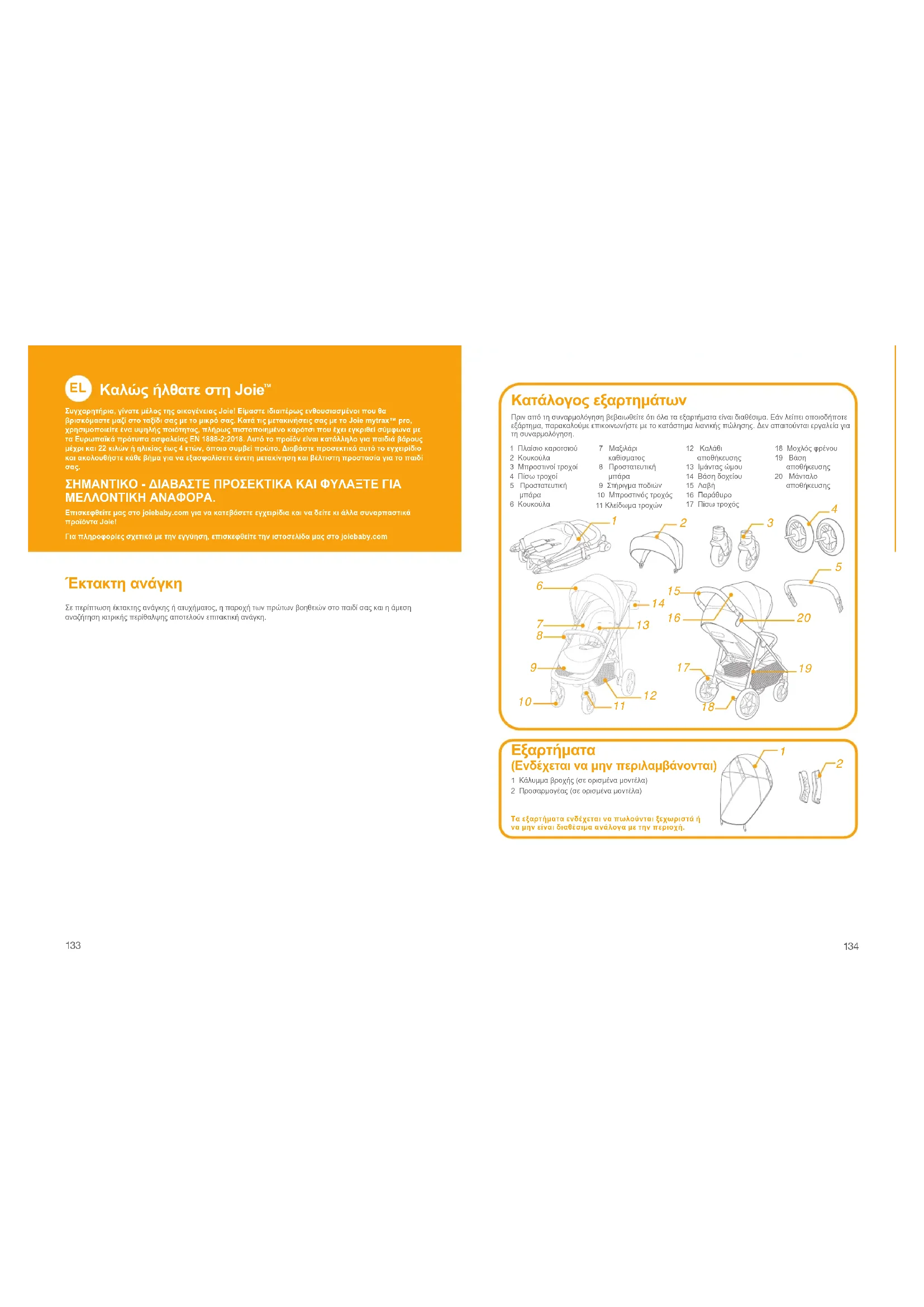 ΣΗΜΑΝΤΙΚΟ - ΔΙΑΒΑΣΤΕ ΠΡΟΣΕΚΤΙΚΑ ΚΑΙ ΦΥΛΑΞΤΕ ΓΙΑ ΜΕΛΛΟΝΤΙΚΗ ΑΝΑΦΟΡΑ. Επισκεφθείτε μας στο joiebaby.com για να κατεβάσετε εγχειρίδια και να δείτε κι άλλα συναρπαστικά προϊόντα Joie!Για πληροφορίες σχετικά με την εγγύηση, επισκεφθείτε την ιστοσελίδα μας στο joiebaby.com Έκτακτη ανάγκη Σε περίπτωση έκτακτης ανάγκης ή ατυχήματος, η παροχή των πρώτων βοηθειών στο παιδί σας και η άμεση αναζήτηση ιατρικής περίθαλψης αποτελούν επιτακτική ανάγκη.