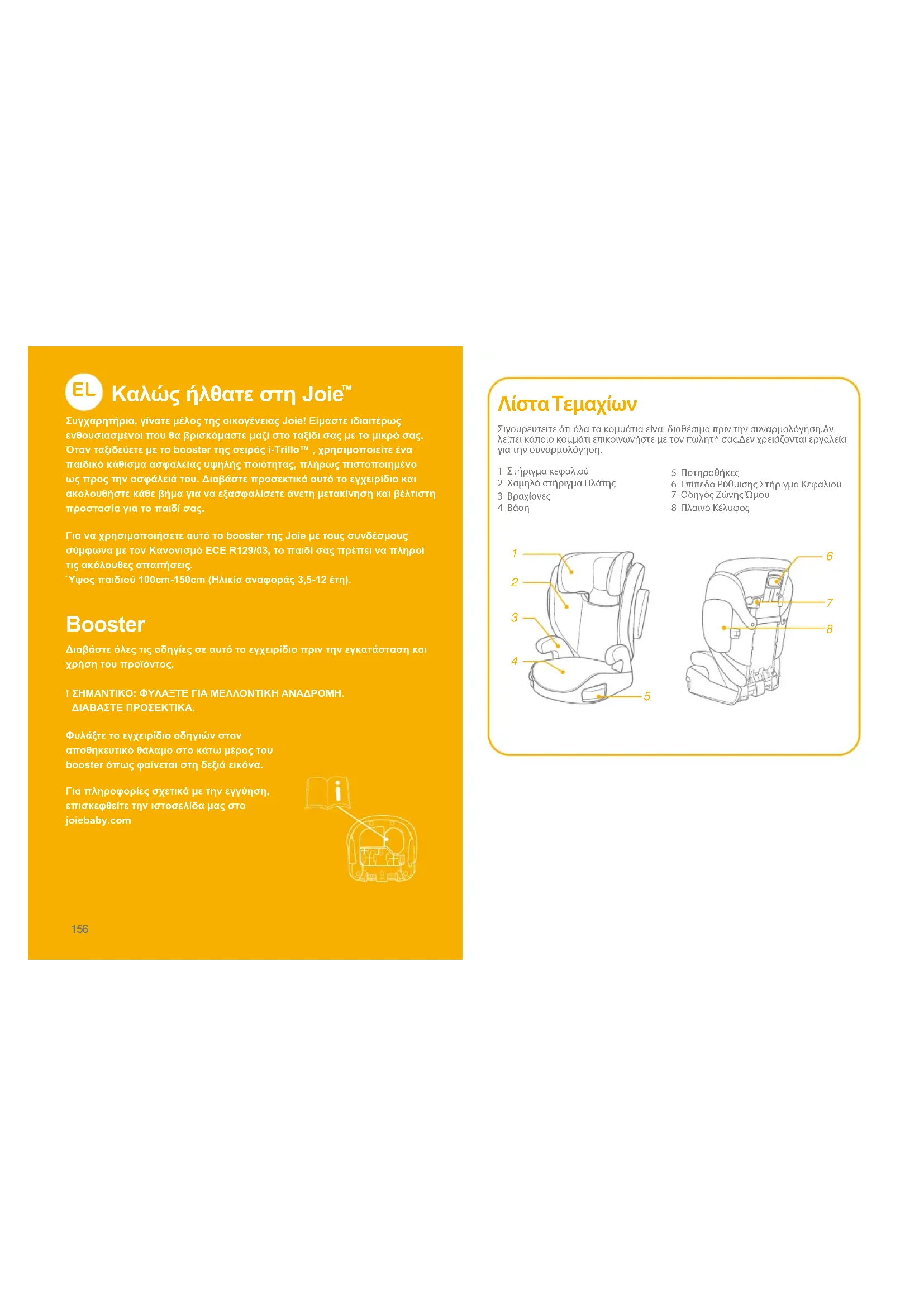 Συγχαρητήρια, γίνατε μέλος της οικογένειας Joie! Είμαστε ιδιαιτέρως ενθουσιασμένοι που θα βρισκόμαστε μαζί στο ταξίδι σας με το μικρό σας. Όταν ταξιδεύετε με το booster της σειράς i-Trillo™ , χρησιμοποιείτε ένα παιδικό κάθισμα ασφαλείας υψηλής ποιότητας, πλήρως πιστοποιημένο ως προς την ασφάλειά του. Διαβάστε προσεκτικά αυτό το εγχειρίδιο και ακολουθήστε κάθε βήμα για να εξασφαλίσετε άνετη μετακίνηση και βέλτιστη προστασία για το παιδί σας.Για να χρησιμοποιήσετε αυτό το booster της Joie με τους συνδέσμους σύμφωνα με τον Κανονισμό ECE R129/03, το παιδί σας πρέπει να πληροί τις ακόλουθες απαιτήσεις.Ύψος παιδιού 100cm-150cm (Ηλικία αναφοράς 3,5-12 έτη). Booster Διαβάστε όλες τις οδηγίες σε αυτό το εγχειρίδιο πριν την εγκατάσταση και χρήση του προϊόντος.! ΣΗΜΑΝΤΙΚΟ: ΦΥΛΑΞΤΕ ΓΙΑ ΜΕΛΛΟΝΤΙΚΗ ΑΝΑΔΡΟΜΗ. ΔΙΑΒΑΣΤΕ ΠΡΟΣΕΚΤΙΚΑ.Φυλάξτε το εγχειρίδιο οδηγιών στον αποθηκευτικό θάλαμο στο κάτω μέρος του booster όπως φαίνεται στη δεξιά εικόνα.Για πληροφορίες σχετικά με την εγγύηση, επισκεφθείτε την ιστοσελίδα μας στο joiebaby.com Λίστα Τεμαχίων Σιγουρευτείτε ότι όλα τα κομμάτια είναι διαθέσιμα πριν την συναρμολόγηση.Αν λείπει κάποιο κομμάτι επικοινωνήστε με τον πωλητή σας.Δεν χρειάζονται εργαλεία για την συναρμολόγηση. 1 Στήριγμα κεφαλιού 2 Χαμηλό στήριγμα Πλάτης3 Βραχίονες 4 Βάση5 Ποτηροθήκες6 Επίπεδο Ρύθμισης Στήριγμα Κεφαλιού 7 Οδηγός Ζώνης Ώμου8 Πλαινό Κέλυφος157 158 ΠΡΟΕΙΔΟΠΟΙΗΣΗ ! ΚΑΝΕΝΑ Booster δεν μπορεί να εγγυηθεί πλήρη προστασία από τραυματισμούς σε περίπτωση ατυχήματος. Η ορθή ωστόσο χρήση του συγκεκριμένου booster θα μειώσει τον κίνδυνο σοβαρού τραυματισμού ή θανάτου για το παιδί σας. ! Ακολουθείτε πάντα σωστά τις οδηγίες εγκατάστασης, ώστε να διασφαλίζεται ότι το booster παρέχει βέλτιστο επίπεδο ασφάλειας. ! Φροντίστε ώστε τα άκαμπτα αντικείμενα και τα πλαστικά μέρη του booster να τοποθετηθούν και να εγκατασταθούν με τρόπο που να μην είναι δυνατόν να παγιδευτούν από ένα κινητό κάθισμα ή την πόρτα του οχήματος. ! Για να χρησιμοποιήσετε αυτό το booster σύμφωνα με τον Κανονισμό ECE R129/03, το παιδί σας πρέπει να πληροί τις ακόλουθες απαιτήσεις. Ύψος παιδιού 100cm-150cm (ηλικία αναφοράς: 3.5-12 έτη). Μόνο κατεύθυνση προς τα εμπρός (σε σχέση με την κίνηση του οχήματος) ! Το booster μπορεί να μην ταιριάζει σε όλα τα οχήματα για χρήση με παιδιά ύψους 135cm-150cm. ! Οι ιμάντες που συγκρατούν το booster στο όχημα πρέπει να είναι σφιχτοί και δεν πρέπει να είναι συστραμμένοι. ! Το booster πρέπει να αντικατασταθεί εάν υποστεί έντονη καταπόνηση σε περίπτωση ατυχήματος ή εάν πέσει