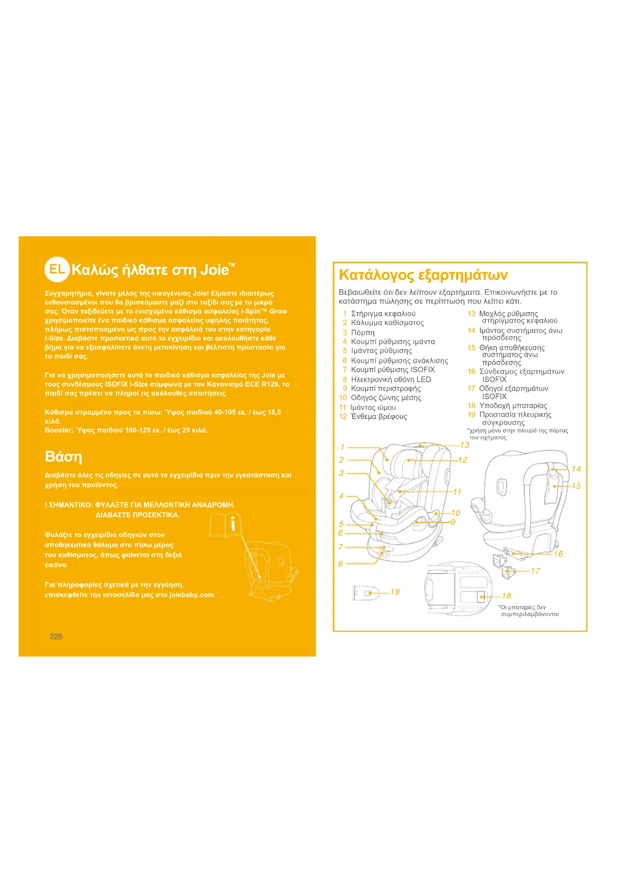 Συγχαρητήρια, γίνατε μέλος της οικογένειας Joie! Είμαστε ιδιαιτέρως ενθουσιασμένοι που θα βρισκόμαστε μαζί στο ταξίδι σας με το μικρό σας. Όταν ταξιδεύετε με το ενισχυμένο κάθισμα ασφαλείας i-Spin™ Grow χρησιμοποιείτε ένα παιδικό κάθισμα ασφαλείας υψηλής ποιότητας, πλήρως πιστοποιημένο ως προς την ασφάλειά του στην κατηγορία i-Size. Διαβάστε προσεκτικά αυτό το εγχειρίδιο και ακολουθήστε κάθε βήμα για να εξασφαλίσετε άνετη μετακίνηση και βέλτιστη προστασία για το παιδί σας.Για να χρησιμοποιήσετε αυτό το παιδικό κάθισμα ασφαλείας της Joie με τους συνδέσμους ISOFIX i-Size σύμφωνα με τον Κανονισμό ECE R129, το παιδί σας πρέπει να πληροί τις ακόλουθες απαιτήσεις.Κάθισμα στραμμένο προς τα πίσω: Ύψος παιδιού 40-105 εκ. / έως 18,5 κιλά.Booster: Ύψος παιδιού 100-125 εκ. / έως 25 κιλά. Διαβάστε όλες τις οδηγίες σε αυτό το εγχειρίδιο πριν την εγκατάσταση και χρήση του προϊόντος.! ΣΗΜΑΝΤΙΚΟ: ΦΥΛΑΞΤΕ ΓΙΑ ΜΕΛΛΟΝΤΙΚΗ ΑΝΑΔΡΟΜΗ.ΔΙΑΒΑΣΤΕ ΠΡΟΣΕΚΤΙΚΑ.Φυλάξτε το εγχειρίδιο οδηγιών στον αποθηκευτικό θάλαμο στο πίσω μέρος του καθίσματος, όπως φαίνεται στη δεξιά εικόνα.Για πληροφορίες σχετικά με την εγγύηση, επισκεφθείτε την ιστοσελίδα μας στο joiebaby.com Κατάλογος εξαρτημάτων 1 Στήριγμα κεφαλιού 2 Κάλυμμα καθίσματος 3 Πόρπη 4 Κουμπί ρύθμισης ιμάντα 5 Ιμάντας ρύθμισης 6 Κουμπί ρύθμισης ανάκλισης 7 Κουμπί ρύθμισης ISOFIX 8 Ηλεκτρονική οθόνη LED 9 Κουμπί περιστροφής10 Οδηγός ζώνης μέσης11 Ιμάντας ώμου12 Ένθεμα βρέφους13 Μοχλός ρύθμισης στηρίγματος κεφαλιού14 Ιμάντας συστήματος άνω πρόσδεσης15 Θήκη αποθήκευσης συστήματος άνω πρόσδεσης16 Σύνδεσμος εξαρτημάτων ISOFIX17 Οδηγοί εξαρτημάτων ISOFIX 18 Υποδοχή μπαταρίας19 Προστασία πλευρικής σύγκρουσηςΒεβαιωθείτε ότι δεν λείπουν εξαρτήματα. Επικοινωνήστε με το κατάστημα πώλησης σε περίπτωση που λείπει κάτι.