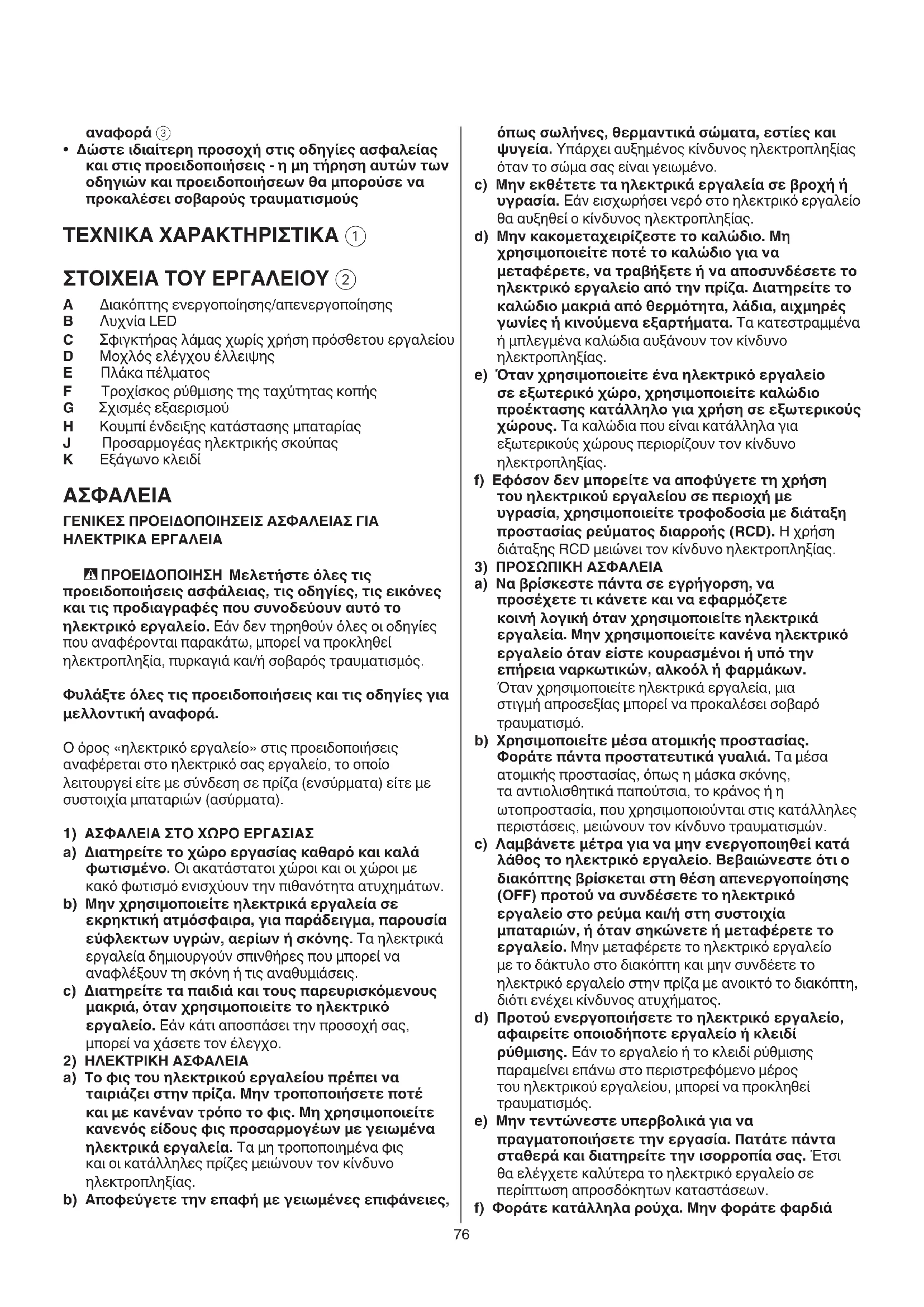 ΓΕΝΙΚΕΣΠΡΟΕΙΔΟΠΟΙΗΣΕΙΣΑΣΦΑΛΕΙΑΣΓΙΑ ΗΛΕΚΤΡΙΚΑΕΡΓΑΛΕΙΑ - ΠΡΟΕΙΔΟΠΟΙΗΣΗ Μελετήστεόλεςτις προειδοποιήσειςασφάλειας,τιςοδηγίες,τιςεικόνες καιτιςπροδιαγραφέςπουσυνοδεύουναυτότο ηλεκτρικόεργαλείο.Εάν δεν τηρηθούν όλες οι οδηγίες που αναφέρονται παρακάτω, μπορεί να προκληθεί ηλεκτροπληξία, πυρκαγιά και/ή σοβαρός τραυματισμός. Φυλάξτεόλεςτιςπροειδοποιήσειςκαιτιςοδηγίεςγια μελλοντικήαναφορά. Ο όρος «ηλεκτρικό εργαλείο» στις προειδοποιήσεις αναφέρεται στο ηλεκτρικό σας εργαλείο, το οποίο λειτουργεί είτε με σύνδεση σε πρίζα (ενσύρματα) είτε με συστοιχία μπαταριών (ασύρματα).