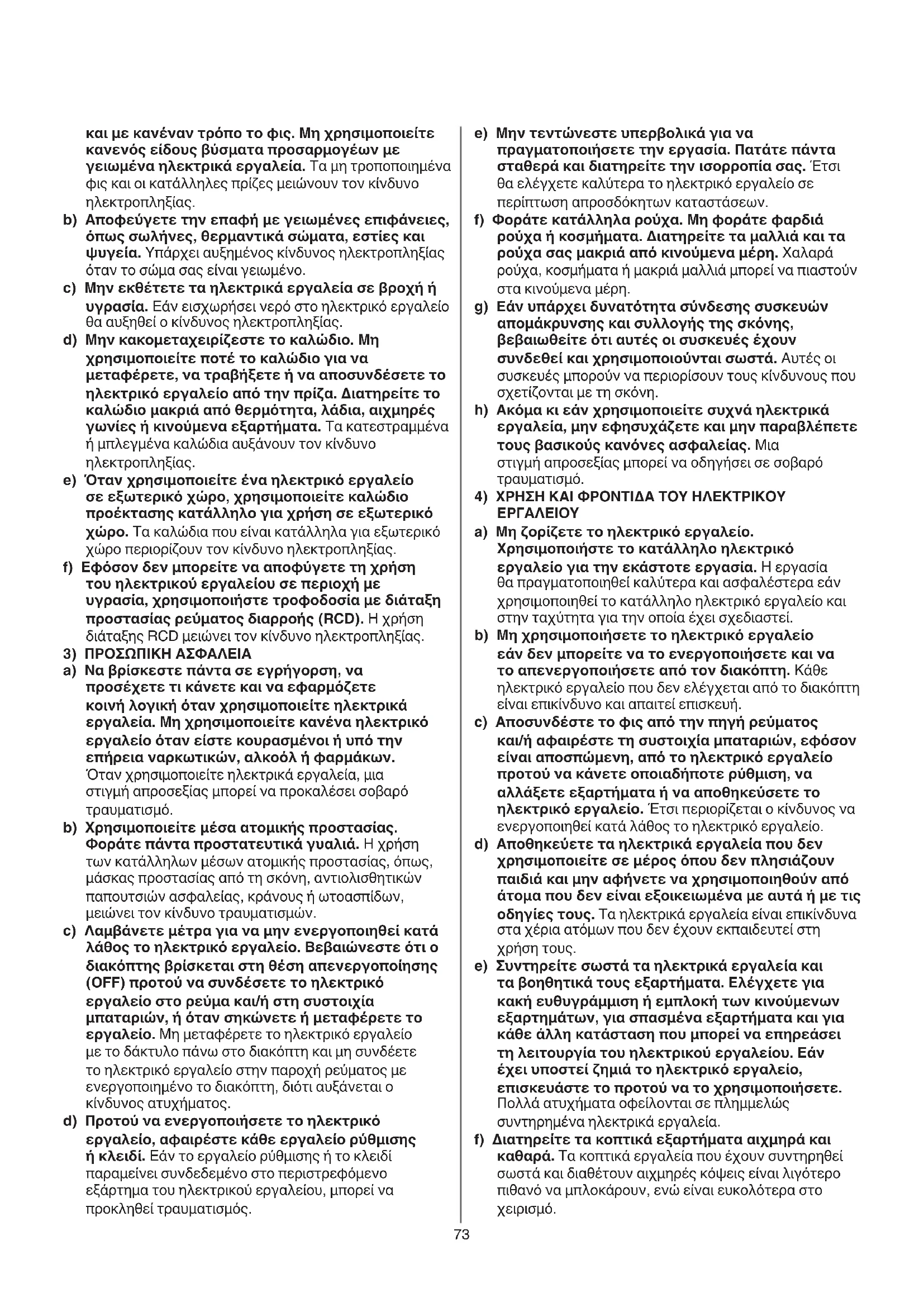 a) Να βρίσκεστε πάντα σε εγρήγορση, να προσέχετε τι κάνετε και να εφαρμόζετε κοινή λογική όταν χρησιμοποιείτε ηλεκτρικά εργαλεία. Μη χρησιμοποιείτε κανένα ηλεκτρικό εργαλείο όταν είστε κουρασμένοι ή υπό την επήρεια ναρκωτικών, αλκοόλ ή φαρμάκων. Όταν χρησιμοποιείτε ηλεκτρικά εργαλεία, μια στιγμή απροσεξίας μπορεί να προκαλέσει σοβαρό τραυματισμό. b) Χρησιμοποιείτε μέσα ατομικής προστασίας. Φοράτε πάντα προστατευτικά γυαλιά. Η χρήση των κατάλληλων μέσων ατομικής προστασίας, όπως, μάσκας προστασίας από τη σκόνη, αντιολισθητικών παπουτσιών ασφαλείας, κράνους ή ωτοασπίδων, μειώνει τον κίνδυνο τραυματισμών. c) Λαμβάνετε μέτρα για να μην ενεργοποιηθεί κατά λάθος το ηλεκτρικό εργαλείο. Βεβαιώνεστε ότι ο διακόπτης βρίσκεται στη θέση απενεργοποίησης (OFF) προτού να συνδέσετε το ηλεκτρικό εργαλείο στο ρεύμα και/ή στη συστοιχία μπαταριών, ή όταν σηκώνετε ή μεταφέρετε το εργαλείο. Μη μεταφέρετε το ηλεκτρικό εργαλείο με το δάκτυλο πάνω στο διακόπτη και μη συνδέετε το ηλεκτρικό εργαλείο στην παροχή ρεύματος με ενεργοποιημένο το διακόπτη, διότι αυξάνεται ο κίνδυνος ατυχήματος. d) Προτού να ενεργοποιήσετε το ηλεκτρικό εργαλείο, αφαιρέστε κάθε εργαλείο ρύθμισης ή κλειδί. Εάν το εργαλείο ρύθμισης ή το κλειδί παραμείνει συνδεδεμένο στο περιστρεφόμενο εξάρτημα του ηλεκτρικού εργαλείου, μπορεί να προκληθεί τραυματισμός.74 a) Το ηλεκτρικό εργαλείο πρέπει να επισκευάζεται μόνο από πιστοποιημένο επαγγελματία, χρησιμοποιώντας μόνο πανομοιότυπα ανταλλακτικά. Με αυτόν τον τρόπο διασφαλίζεται η ασφαλής λειτουργία του ηλεκτρικού εργαλείου. b) Μην επιχειρήσετε ποτέ να επισκευάσετε συστοιχία μπαταριών που έχει υποστεί ζημιά. Η συστοιχία μπαταριών πρέπει να επισκευάζεται μόνο από τον κατασκευαστή ή από εξουσιοδοτημένα κέντρα