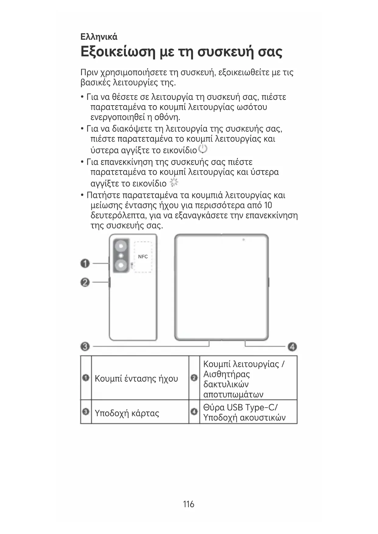 αποτυπωμάτων Υποδοχή κάρτας Θύρα USB Type-C/ Υποδοχή ακουστικών 116• Κατά τη χρήση της λειτουργίας NFC πρέπει να φέρνετε και να κρατάτε την περιοχή NFC κοντά σε άλλες συσκευές ή άλλα αντικείμενα.