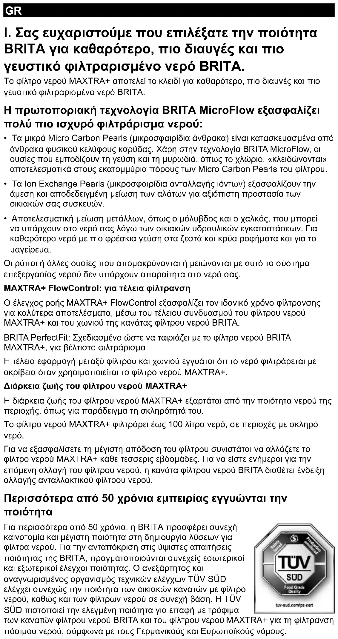Για να εξασφαλίσετε τη μέγιστη απόδοση του φίλτρου συνιστάται να αλλάζετε το φίλτρο νερού MAXTRA+ κάθε τέσσερις εβδομάδες. Για να είστε ενήμεροι για την επόμενη αλλαγή του φίλτρου νερού, η κανάτα φίλτρου νερού BRITA διαθέτει ένδειξη αλλαγής ανταλλακτικού φίλτρου νερού. Περισσότερα από 50 χρόνια εμπειρίας εγγυώνται την