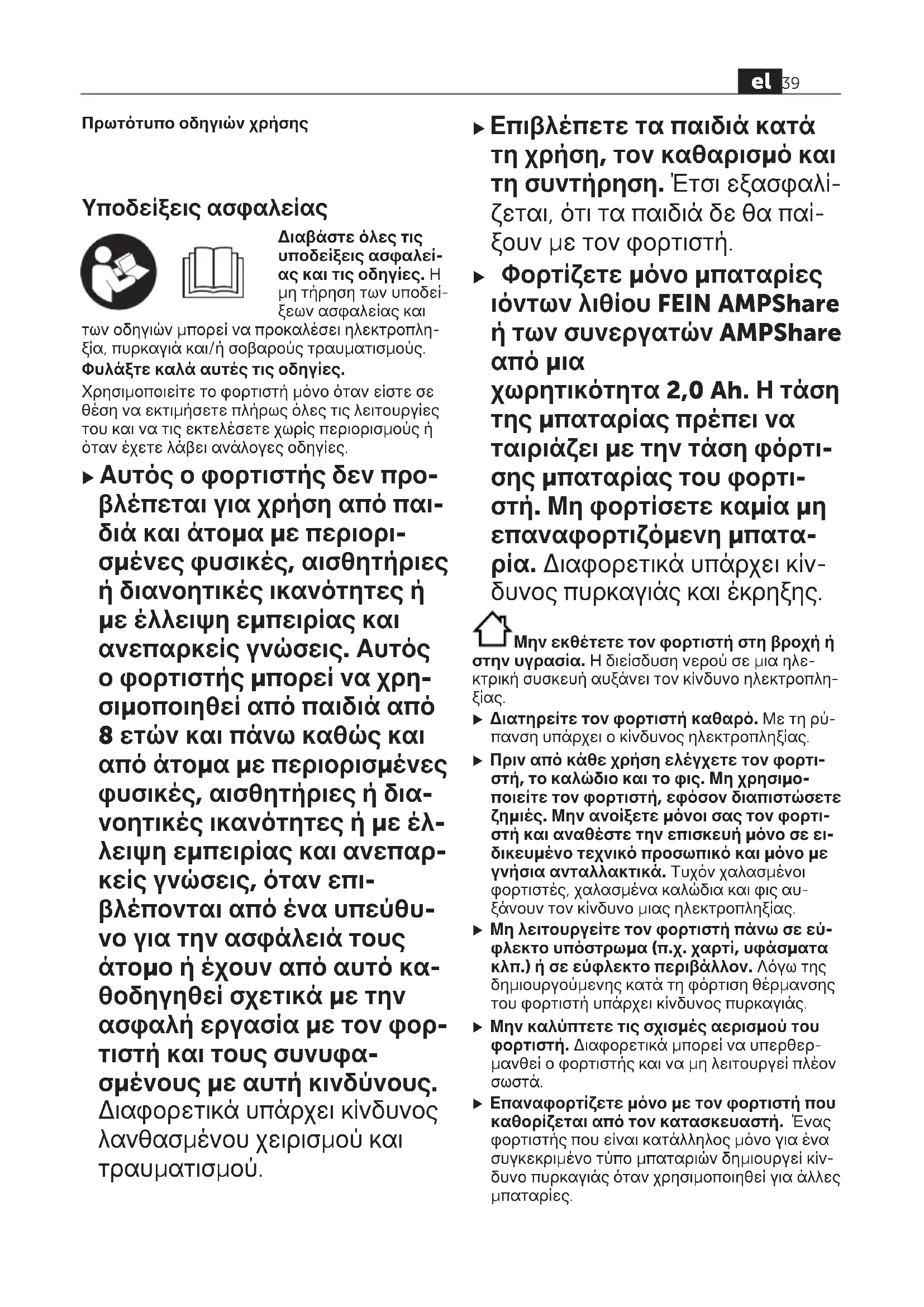 Ελέγξτε την τάση του δικτύου, αναθέστε εν- δεχομένως τον έλεγχο του φορτιστή σε ένα εξουσιοδοτημένο κέντρο σέρβις για ηλε- κτρικά εργαλείαFEIN Υποδείξεις εργασίαςΕλληνικά Ένας σημαντικά μειωμένος χρόνος λειτουργίας μετά τη φόρτιση σημαίνει ότι η μπαταρία εξα- ντλήθηκε και πρέπει να αντικατασταθεί. Σε περιπτώσεις διαρκούς φόρτισης ή αλλεπάλλη- λων, χωρίς διακοπή κύκλων φόρτισης, ο φορτι- στής μπορεί να ζεσταθεί. Αυτό όμως είναι ακίν- δυνο και δεν υποδεικνύει τεχνικό ελάττωμα του