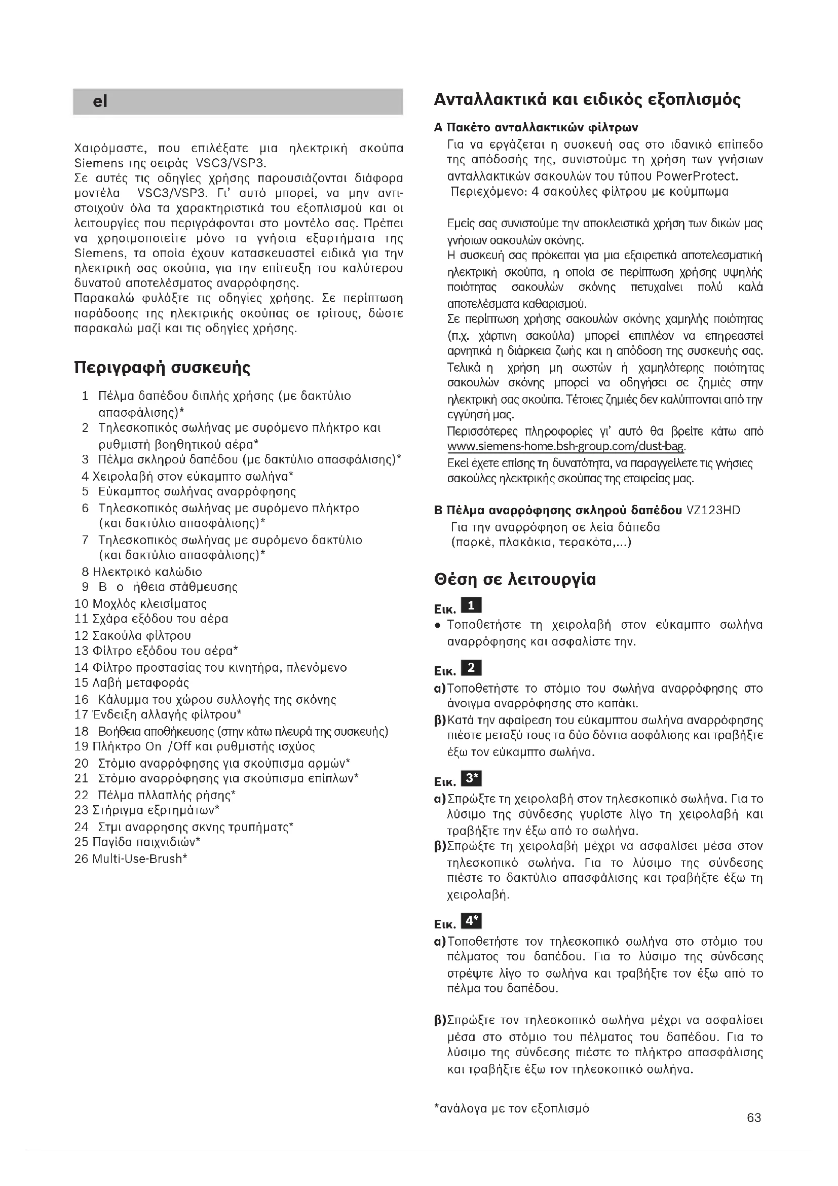 Χαιρόµαστε, που επιλέξατε µια ηλεκτρική σκούπα Siemensτης σειράς VSC3/VSP3. Σε αυτές τις οδηγίες χρήσης παρουσιάζονται διάφορα µοντέλα VSC3/VSP3. Γι’ αυτό µπορεί, να µην αντι- στοιχούν όλα τα χαρακτηριστικά του εξοπλισµού και οι λειτουργίες που περιγράφονται στο µοντέλο σας. Πρέπει να χρησιµοποιείτε µόνο τα γνήσια εξαρτήµατα της Siemens, τα οποία έχουν κατασκευαστεί ειδικά για την ηλεκτρική σας σκούπα, για την επίτευξη του καλύτερου δυνατού αποτελέσµατος αναρρόφησης. Παρακαλώ φυλάξτε τις οδηγίες χρήσης. Σε περίπτωση παράδοσης της ηλεκτρικής σκούπας σε τρίτους, δώστε παρακαλώ µαζί και τις οδηγίες χρήσης. Περιγραφή συσκευής 1 Πέλμα δαπέδου διπλής χρήσης (με δακτύλιο απασφάλισης)* 2Τηλεσκοπικός σωλήνας με συρόμενο πλήκτρο και ρυθμιστή βοηθητικού αέρα* 3 Πέλμα σκληρού δαπέδου (με δακτύλιο απασφάλισης)* 4 Χειρολαβή στον εύκαμπτο σωλήνα* 5 Εύκαμπτος σωλήνας αναρρόφησης 6Τηλεσκοπικός σωλήνας με συρόμενο πλήκτρο (και δακτύλιο απασφάλισης)* 7Τηλεσκοπικός σωλήνας με συρόμενο δακτύλιο (και δακτύλιο απασφάλισης)* 8 Ηλεκτρικό καλώδιο 9Βοήθεια στάθμευσης 10 Μοχλός κλεισίματος 11 Σχάρα εξόδου του αέρα 12 Σακούλα φίλτρου 13 Φίλτρο εξόδου του αέρα* 14 Φίλτρο προστασίας του κινητήρα, πλενόμενο 15 Λαβή μεταφοράς 16 Κάλυμμα του χώρου συλλογής της σκόνης 17 Ένδειξη αλλαγής φίλτρου* 18 Βοήθεια αποθήκευσης (στην κάτω πλευρά της συσκευής) 19 Πλήκτρο On /Off και ρυθμιστής ισχύος 20 Στόμιο αναρρόφησης για σκούπισμα αρμών* 21 Στόμιο αναρρόφησης για σκούπισμα επίπλων* 22 Πέλμα πλλαπλής ρήσης* 23 Στήριγμα εξρτημάτων* 24 Στμι αναρρησης σκνης τρυπήματς* 25 Παγίδα παιχνιδιών* 26 Multi-Use-Brush*