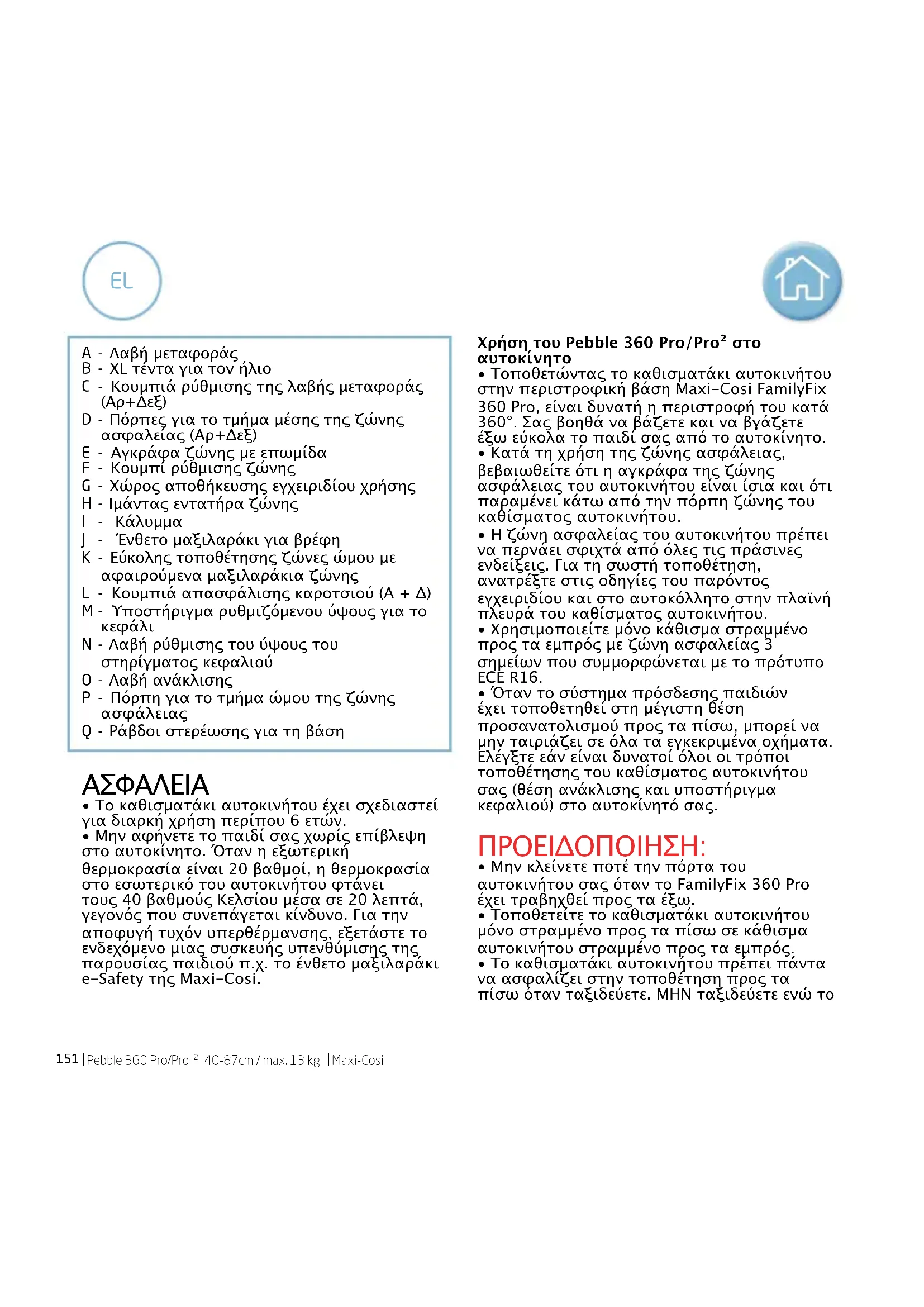 Το Pebble 360 Pro/Pro² αποτελεί ένα «παγκόσμιας» χρήσης βελτιωμένο σύστημα συγκράτησης παιδιού μέσω ζώνης ασφάλειας. Είναι εγκεκριμένο βάσει του υπ' αριθμ. 129 Κανονισμού i-Size για χρήση πρωτίστως σε «παγκόσμιες θέσεις καθήμενου» όπως υποδηλώνεται από τους κατασκευαστές στο εγχειρίδιο χρήσης του οχήματος. Σε περίπτωση αμφιβολιών, απευθυνθείτε στον κατασκευαστή του βελτιωμένου συστήματος πρόσδεσης παιδιών ή στον προμηθευτή σας. Το εν λόγω βρεφικό καθισματάκι αυτοκινήτου, μέλος της 360 Pro Family, προσφέρει πλήρη ελευθερία κινήσεων από τη γέννηση έως την ηλικία περίπου των 4 ετών. Για περισσότερες πληροφορίες σχετικά με τον κανονισμό i-Size, επισκεφθείτε την ιστοσελίδα μας www.maxi-cosi.com.15