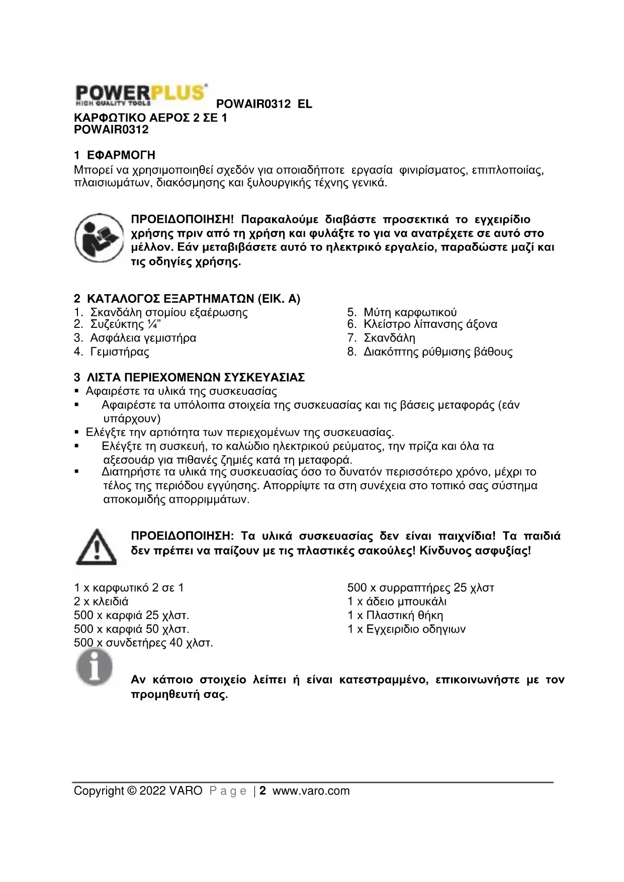 - 16 ΔΗΛΩΣΗ ΣΥΜΜΟΡΦΩΣΗΣ POWAIR0312 EL Copyright © 2022 VARO P a g e | 2 www.varo.com ΚΑΡΦΩΤΙΚΟ ΑΕΡΟΣ 2 ΣΕ 1 POWAIR0312 1 ΕΦΑΡΜΟΓΗ Μπορεί να χρησιμοποιηθεί σχεδόν για οποιαδήποτε εργασία φινιρίσματος, επιπλοποιίας, πλαισιωμάτων, διακόσμησης και ξυλουργικής τέχνης γενικά. ΠΡΟΕΙΔΟΠΟΙΗΣΗ! Παρακαλούμε διαβάστε προσεκτικά το εγχειρίδιο χρήσης πριν από τη χρήση και φυλάξτε το για να ανατρέχετε σε αυτό στο μέλλον. Εάν μεταβιβάσετε αυτό το ηλεκτρικό εργαλείο, παραδώστε μαζί και τις οδηγίες χρήσης. 2 ΚΑΤΑΛΟΓΟΣ ΕΞΑΡΤΗΜΑΤΩΝ (EIK. A) p. 13