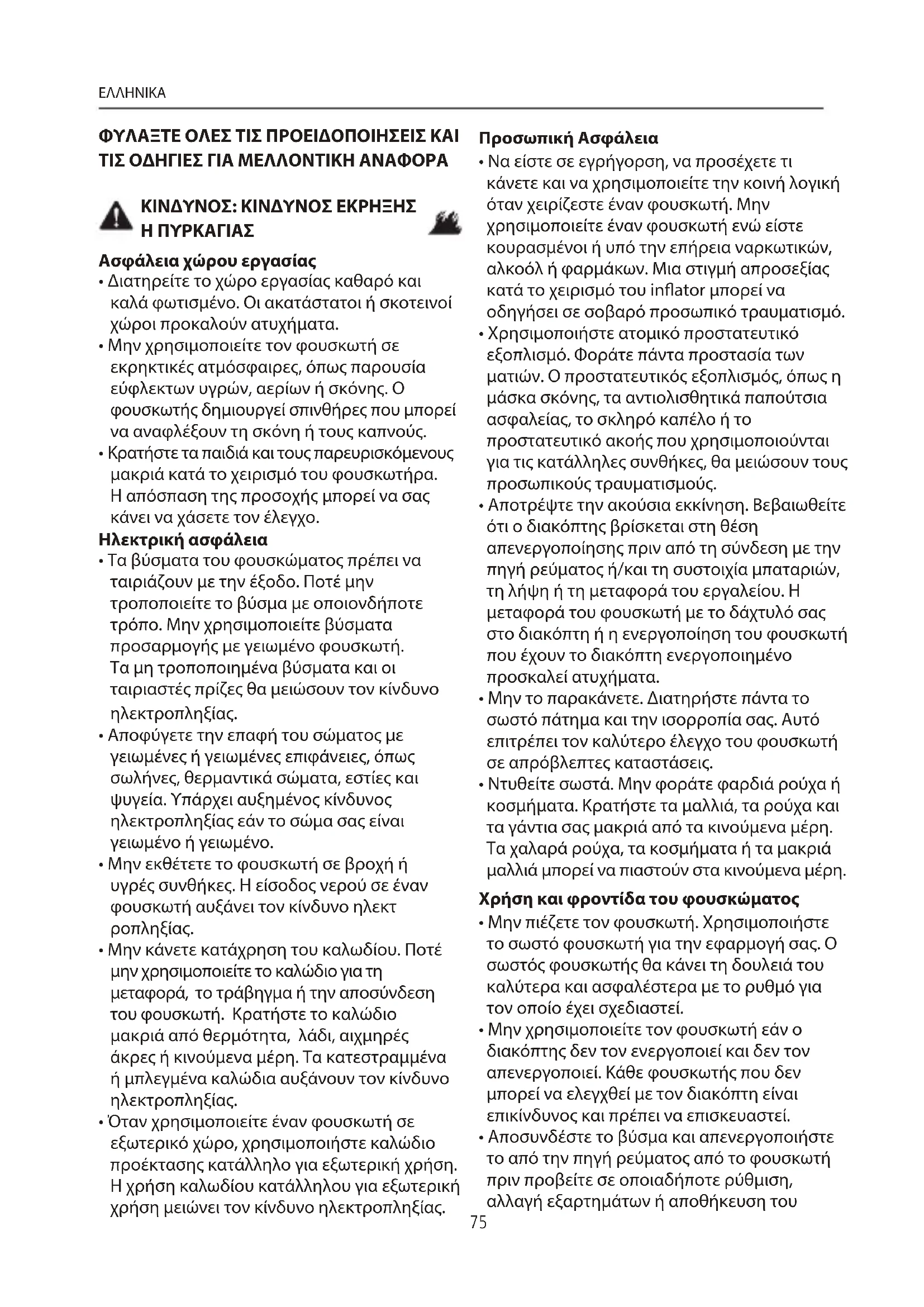 ΦΥΛΑΞΤΕ ΟΛΕΣ ΤΙΣ ΠΡΟΕΙΔΟΠΟΙΗΣΕΙΣ ΚΑΙ ΤΙΣ ΟΔΗΓΙΕΣ ΓΙΑ ΜΕΛΛΟΝΤΙΚΗ ΑΝΑΦΟΡΑ ΚΙΝΔΥΝΟΣ: ΚΙΝΔΥΝΟΣ ΕΚΡΗΞΗΣ Η ΠΥΡΚΑΓΙΑΣ Ασφάλεια χώρου εργασίας