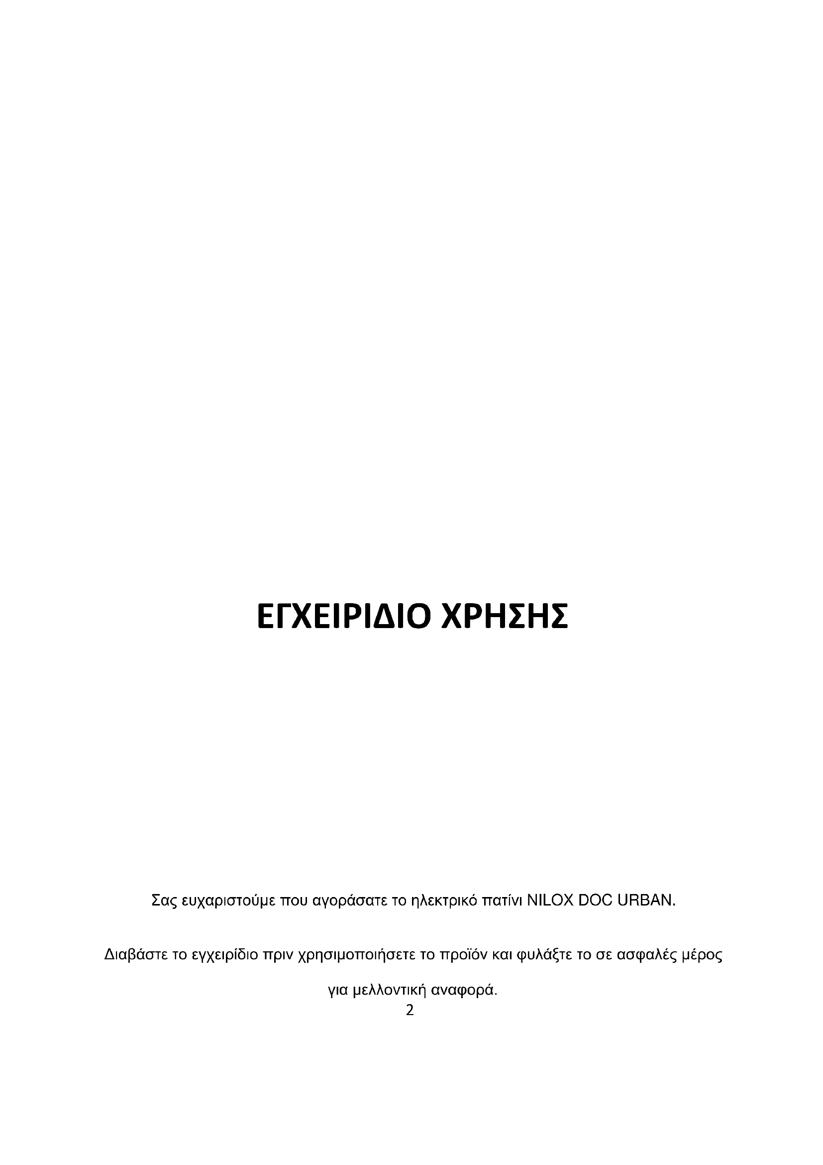 Σας ευχαριστούμε που αγοράσατε το ηλεκτρικό πατίνι NILOX DOC URBAN. Διαβάστε το εγχειρίδιο πριν χρησιμοποιήσετε το προϊόν και φυλάξτε το σε ασφαλές μέρος για μελλοντική αναφορά.
