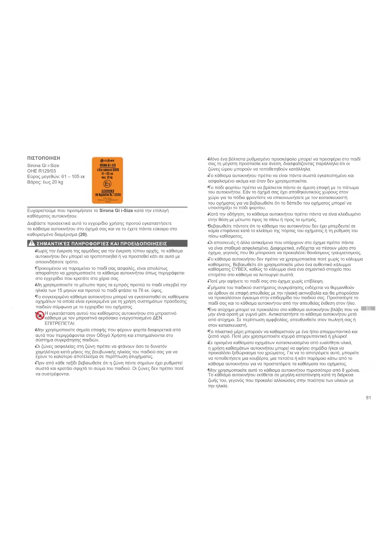 ΠΙΣΤΟΠΟΙΗΣΗ Sirona Gi i-Size ΟΗΕ R129/03 Εύρος μεγεθών: 61 – 105 εκ Βάρος: έως 20 kg