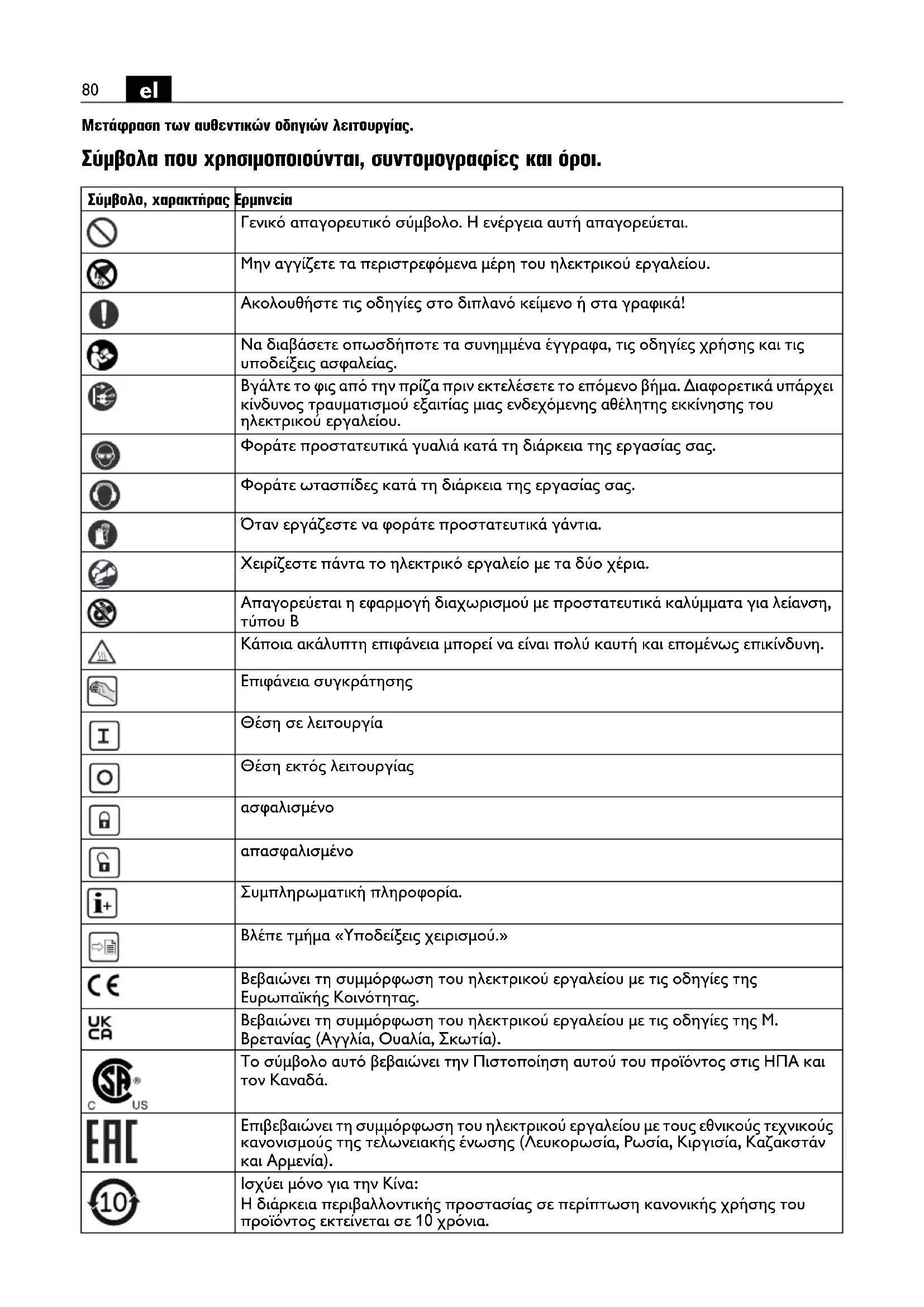 Κάποια ακάλυπτη επιφάνεια μπορεί να είναι πολύ καυτή και επομένως επικίνδυνη. Επιφάνεια συγκράτησης Θέση σε λειτουργία Θέση εκτός λειτουργίας ασφαλισμένο απασφαλισμένο Συμπληρωματική πληροφορία. Βλέπε τμήμα «Υποδείξεις χειρισμού.» Βεβαιώνει τη συμμόρφωση του ηλεκτρικού εργαλείου με τις οδηγίες της Ευρωπαϊκής Κοινότητας. Βεβαιώνει τη συμμόρφωση του ηλεκτρικού εργαλείου με τις οδηγίες της Μ. Βρετανίας (Αγγλία, Ουαλία, Σκωτία). Το σύμβολο αυτό βεβαιώνει την Πιστοποίηση αυτού του προϊόντος στις ΗΠΑ και τον Καναδά. Επιβεβαιώνει τη συμμόρφωση του ηλεκτρικού εργαλείου με τους εθνικούς τεχνικούς κανονισμούς της τελωνειακής ένωσης (Λευκορωσία, Ρωσία, Κιργισία, Καζακστάν και Αρμενία). Ισχύει μόνο για την Κίνα: Η διάρκεια περιβαλλοντικής προστασίας σε περίπτωση κανονικής χρήσης του προϊόντος εκτείνεται σε 10 χρόνια.81